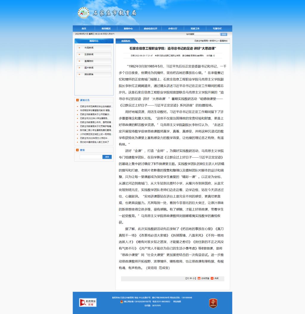 讲好“金课”,打造“金师”。为搞好实践教研活动,马克思主义学院专门组建教学团队,在自学熟读《让群众过上好日子——习近平正定足迹》的基础上集中研讨确定了8节微课堂主题。实践教学团队的8位主讲人对讲稿的撰写和打磨、老照片老影像的搜集和整理以及摄制团队对脚本的设计和调整,只为让每一堂课都成为深受学生喜爱的“精彩一课”。以正定为坐标,从滹沱河边到南城门,从火车站到北贾村小学,从隆兴寺到荣国府,从县文化馆到塔元庄,实践教学团队老师们边走边看、边学边悟,站在今天讲述过往,心潮澎湃。“实地讲课跟站在讲台上是完全不同的感受,更真切更直观,也更具说服力。尤其每到一处,看到今非昔比的巨大变迁,让原汁原味的新思想变得立体多维,很有感触。有了感触,才能上好思政课,带着学生一起受教育。”马克思主义学院思政课教师刘丽娜难掩实践教学的喜悦收获。