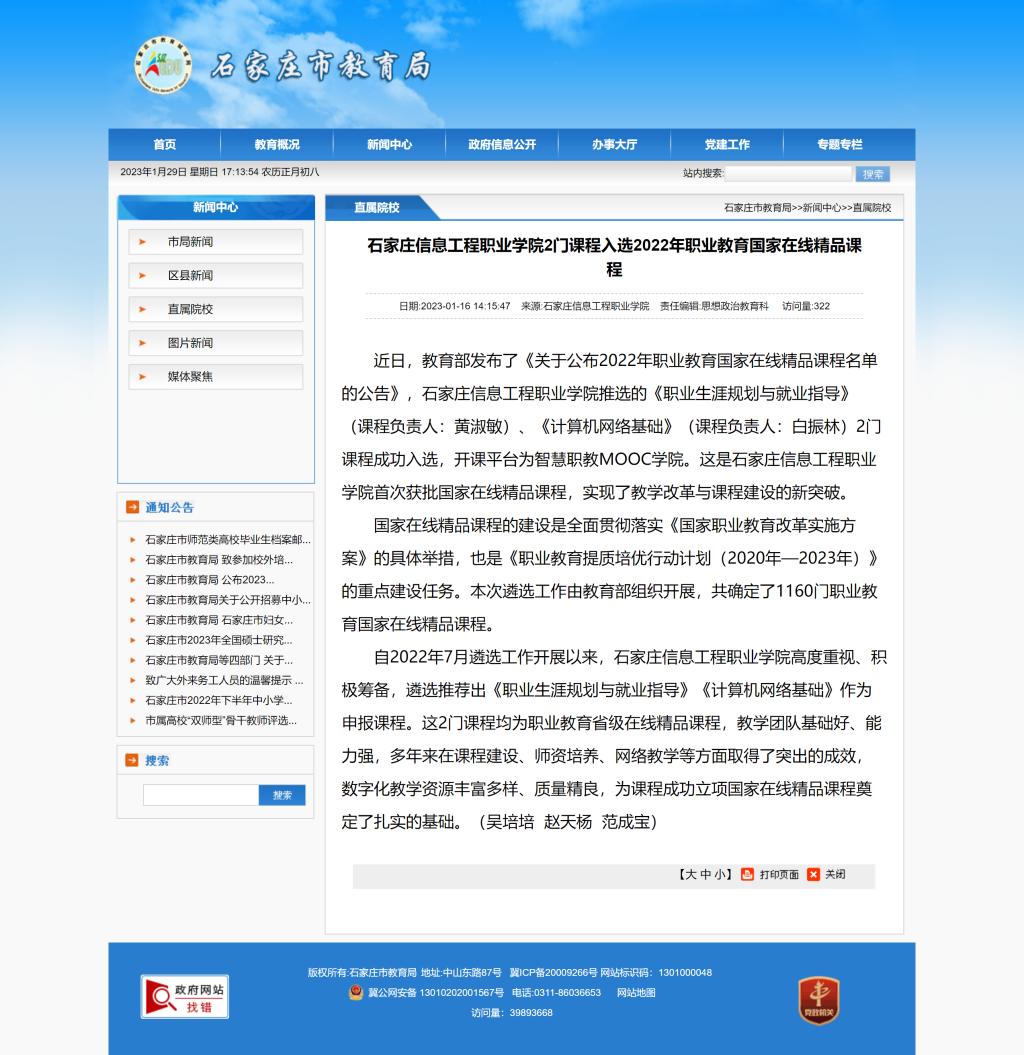 近日,教育部发布了《关于公布2022年职业教育国家在线精品课程名单的公告》,beat365中文官方网站推选的《职业生涯规划与就业指导》(课程负责人:黄淑敏)、《计算机网络基础》(课程负责人:白振林)2门课程成功入选,开课平台为智慧职教MOOC学院。这是beat365中文官方网站首次获批国家在线精品课程,实现了教学改革与课程建设的新突破。