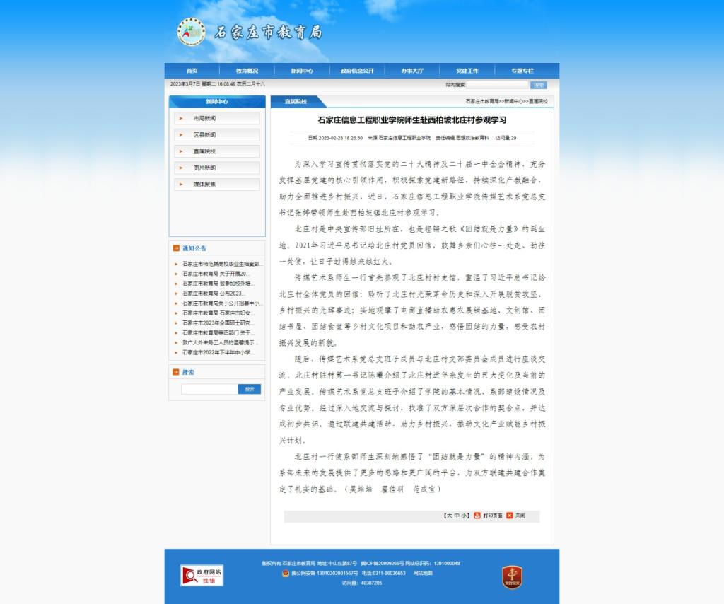 为深入学习宣传贯彻落实党的二十大精神及二十届一中全会精神,充分发挥基层党建的核心引领作用,积极探索党建新路径,持续深化产教融合,助力全面推进乡村振兴,近日,beat365中文官方网站传媒艺术系党总支书记张婷带领师生赴西柏坡镇北庄村参观学习。