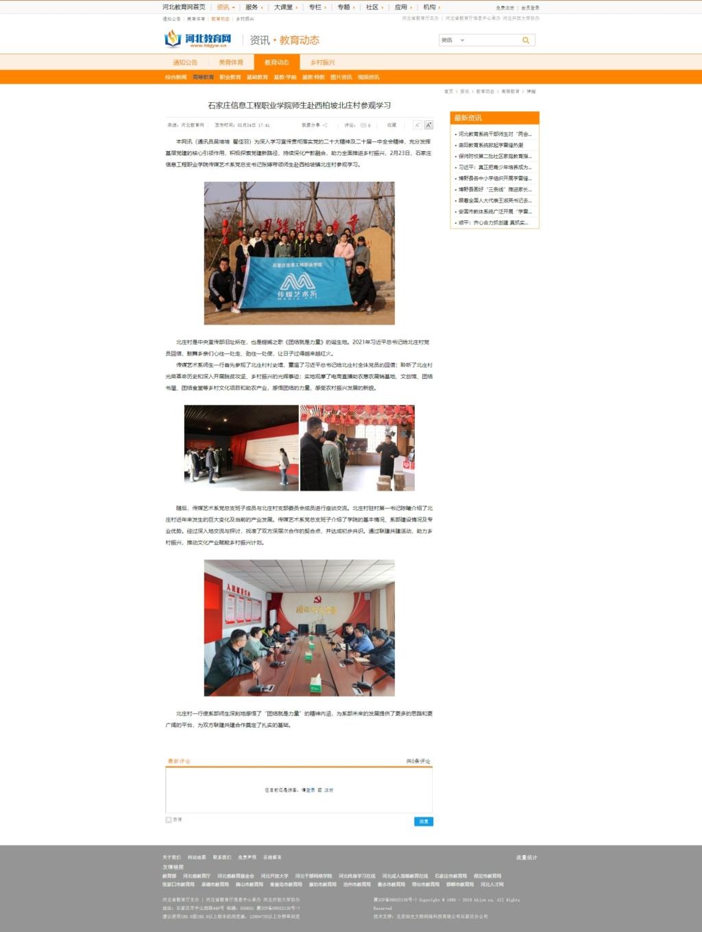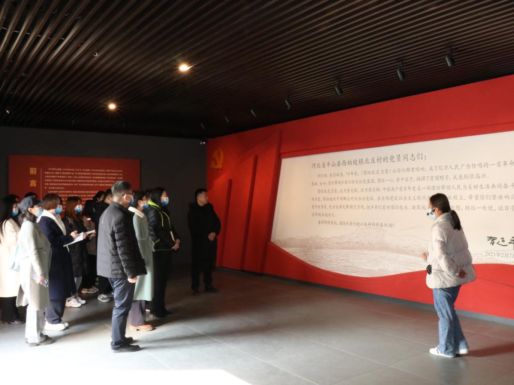 为深入学习宣传贯彻落实党的二十大精神及二十届一中全会精神,充分发挥基层党建的核心引领作用,积极探索党建新路径,持续深化产教融合,助力全面推进乡村振兴,2月23日,beat365中文官方网站传媒艺术系党总支书记张婷带领师生赴西柏坡镇北庄村参观学习。