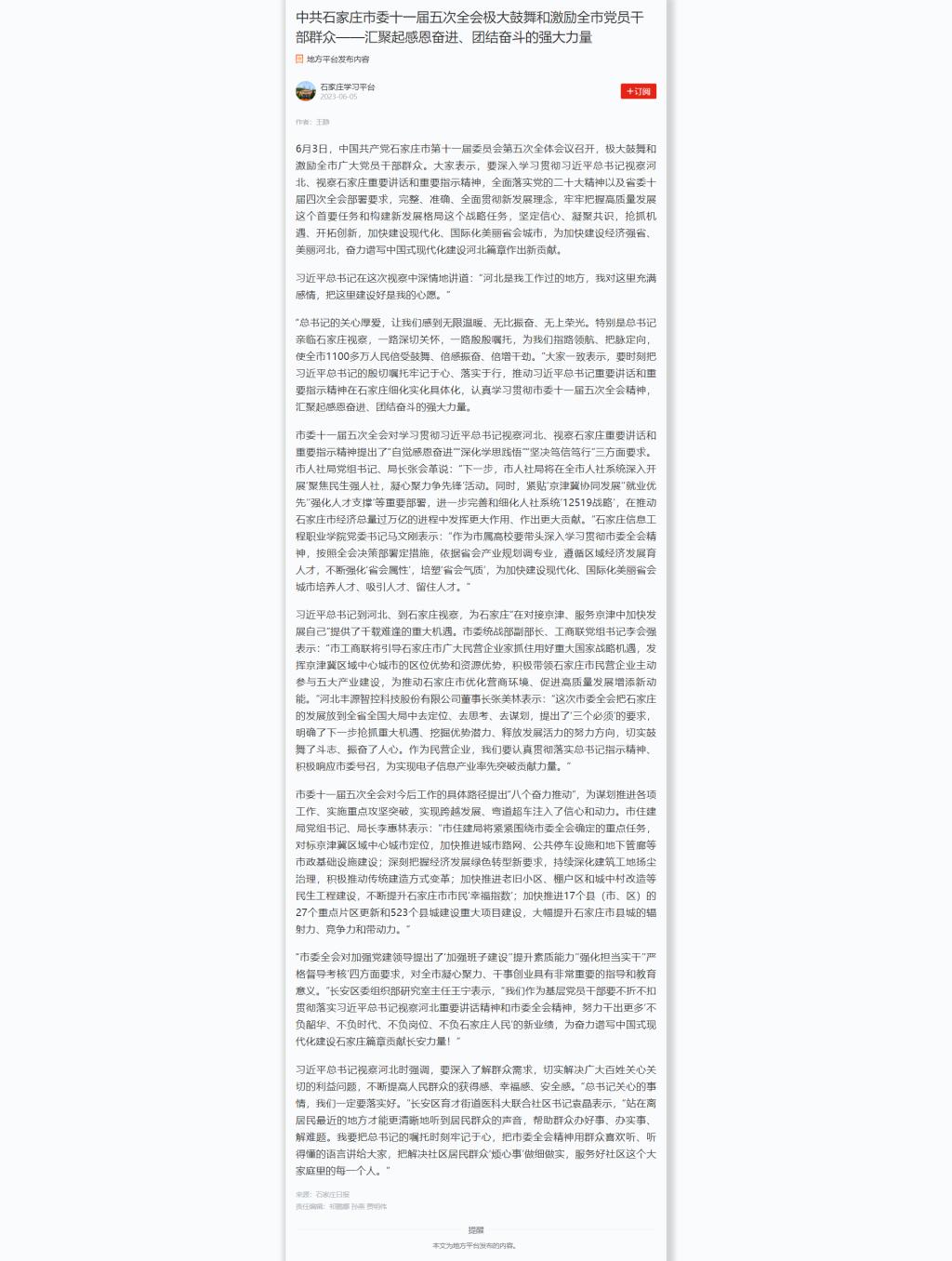 6月3日,中国共产党石家庄市第十一届委员会第五次全体会议召开,极大鼓舞和激励全市广大党员干部群众。大家表示,要深入学习贯彻习近平总书记视察河北、视察石家庄重要讲话和重要指示精神,全面落实党的二十大精神以及省委十届四次全会部署要求,完整、准确、全面贯彻新发展理念,牢牢把握高质量发展这个首要任务和构建新发展格局这个战略任务,坚定信心、凝聚共识,抢抓机遇、开拓创新,加快建设现代化、国际化美丽省会城市,为加快建设经济强省、美丽河北,奋力谱写中国式现代化建设河北篇章作出新贡献。