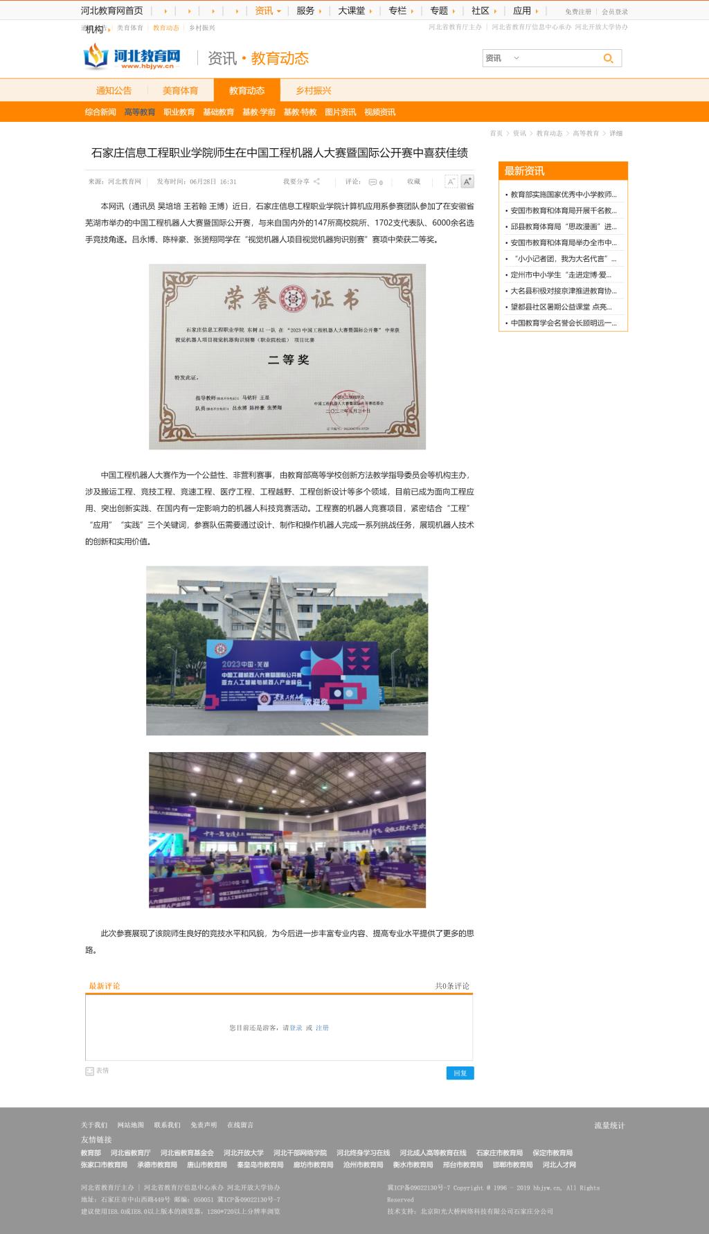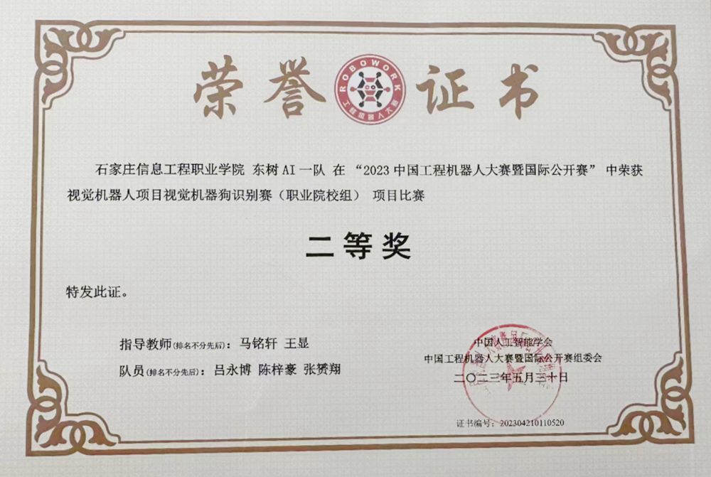 本网讯(通讯员 吴培培 王若翰 王博)近日,beat365中文官方网站计算机应用系参赛团队参加了在安徽省芜湖市举办的中国工程机器人大赛暨国际公开赛,与来自国内外的147所高校院所、1702支代表队、6000余名选手竞技角逐。吕永博、陈梓豪、张赟翔同学在“视觉机器人项目视觉机器狗识别赛”赛项中荣获二等奖。