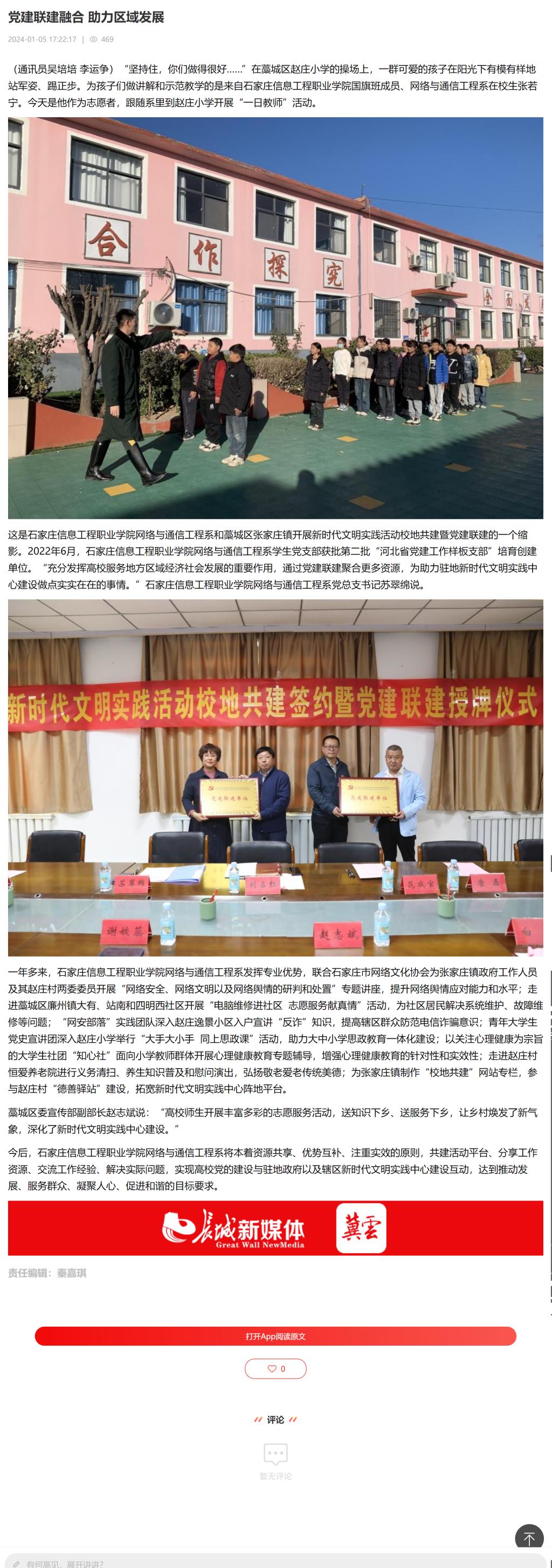 这是beat365中文官方网站网络与通信工程系和藁城区张家庄镇开展新时代文明实践活动校地共建暨党建联建的一个缩影。2022年6月,beat365中文官方网站网络与通信工程系学生党支部获批第二批“河北省党建工作样板支部”培育创建单位。“充分发挥高校服务地方区域经济社会发展的重要作用,通过党建联建聚合更多资源,为助力驻地新时代文明实践中心建设做点实实在在的事情。”beat365中文官方网站网络与通信工程系党总支书记苏翠绵说。