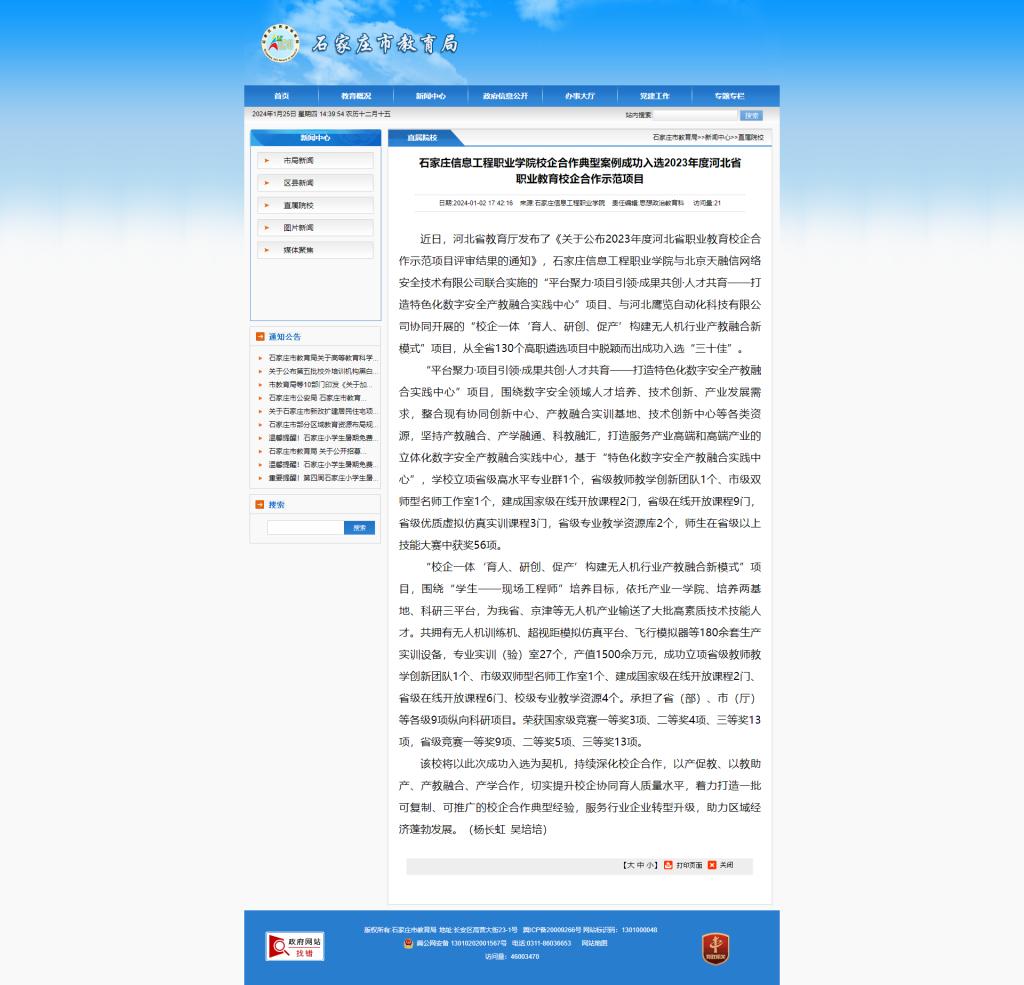 近日,河北省教育厅发布了《关于公布2023年度河北省职业教育校企合作示范项目评审结果的通知》,beat365中文官方网站与北京天融信网络安全技术有限公司联合实施的“平台聚力·项目引领·成果共创·人才共育——打造特色化数字安全产教融合实践中心”项目、与河北鹰览自动化科技有限公司协同开展的“校企一体‘育人、研创、促产’构建无人机行业产教融合新模式”项目,从全省130个高职遴选项目中脱颖而出成功入选“三十佳”。