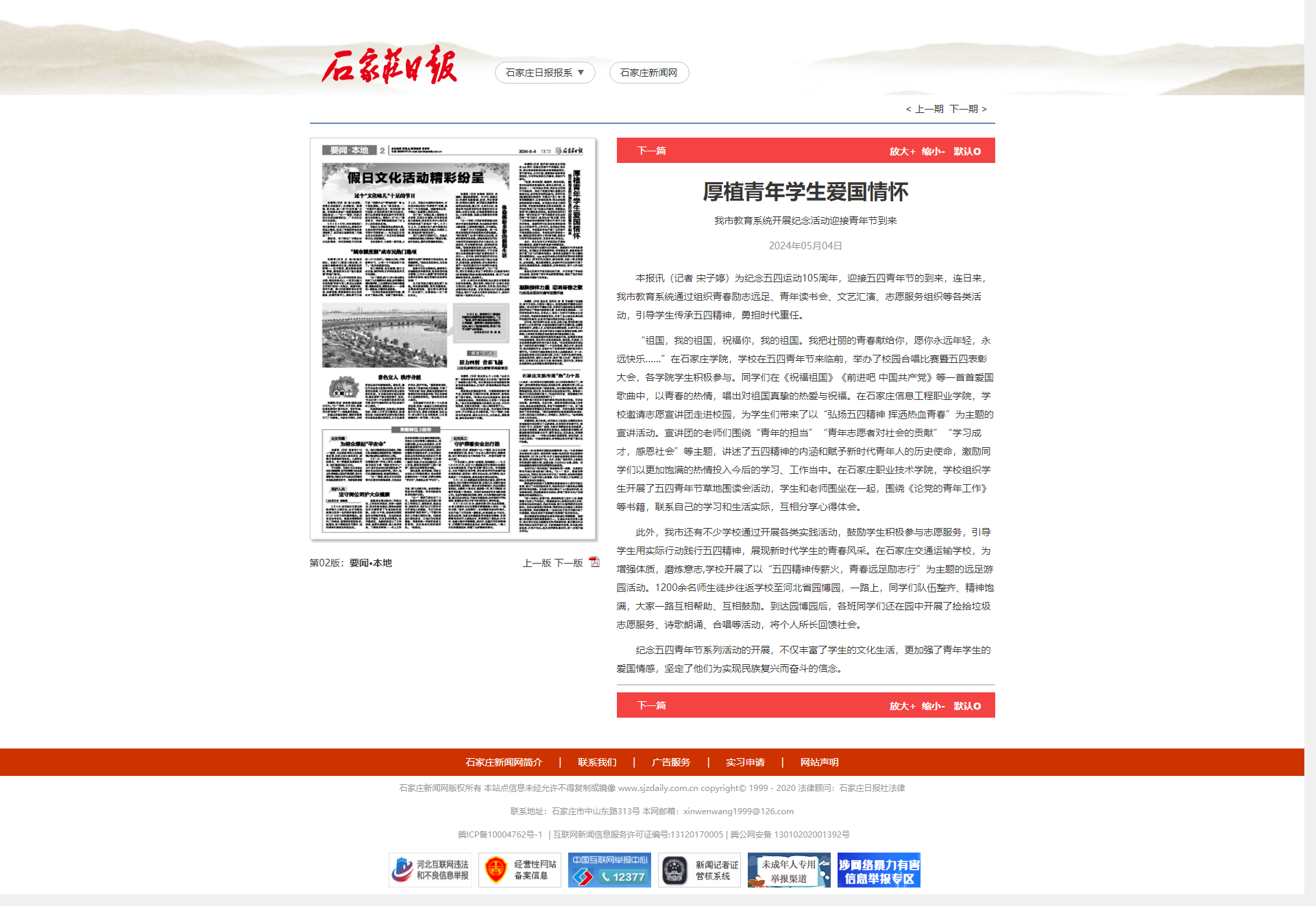 此外,我市还有不少学校通过开展各类实践活动,鼓励学生积极参与志愿服务,引导学生用实际行动践行五四精神,展现新时代学生的青春风采。在石家庄交通运输学校,为增强体质,磨炼意志,学校开展了以“五四精神传薪火,青春远足励志行”为主题的远足游园活动。1200余名师生徒步往返学校至河北省园博园,一路上,同学们队伍整齐、精神饱满,大家一路互相帮助、互相鼓励。到达园博园后,各班同学们还在园中开展了捡拾垃圾志愿服务、诗歌朗诵、合唱等活动,将个人所长回馈社会。