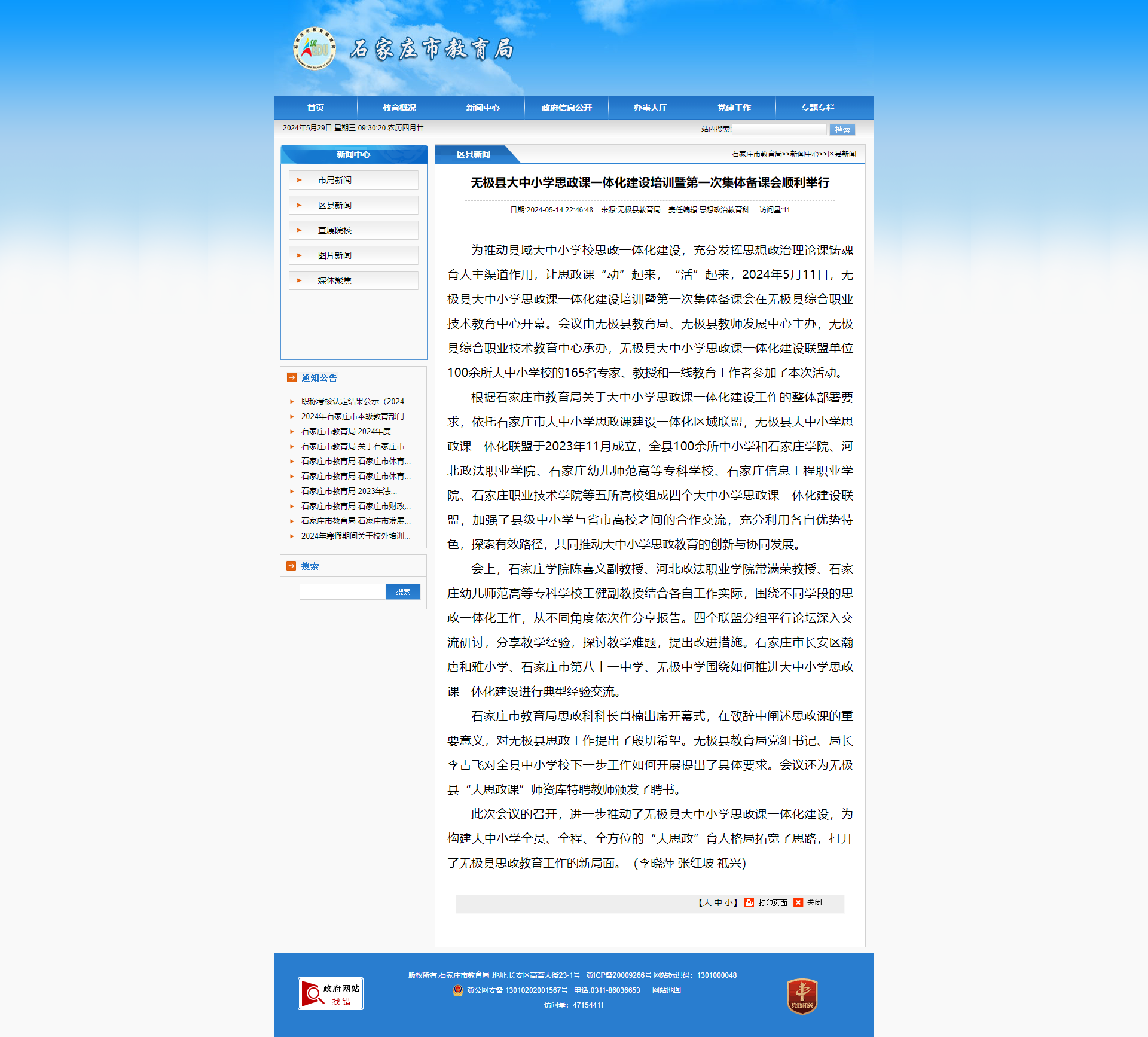 根据石家庄市教育局关于大中小学思政课一体化建设工作的整体部署要求,依托石家庄市大中小学思政课建设一体化区域联盟,无极县大中小学思政课一体化联盟于2023年11月成立,全县100余所中小学和石家庄学院、河北政法职业学院、石家庄幼儿师范高等专科学校、beat365中文官方网站、石家庄职业技术学院等五所高校组成四个大中小学思政课一体化建设联盟,加强了县级中小学与省市高校之间的合作交流,充分利用各自优势特色,探索有效路径,共同推动大中小学思政教育的创新与协同发展。