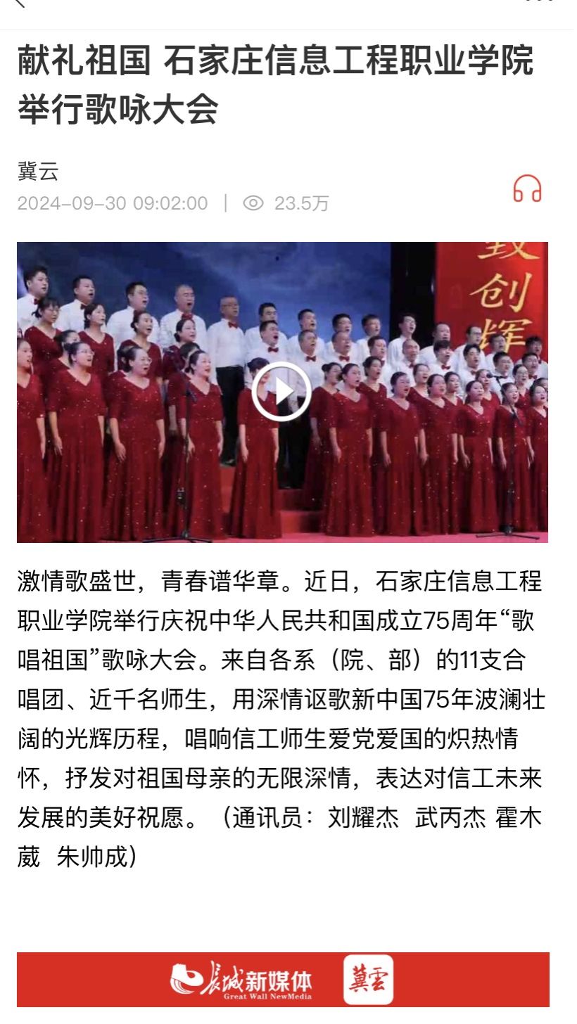 激情歌盛世,青春谱华章。近日,beat365中文官方网站举行庆祝中华人民共和国成立75周年“歌唱祖国”歌咏大会。来自各系(院、部)的11支合唱团、近千名师生,用深情讴歌新中国75年波澜壮阔的光辉历程,唱响信工师生爱党爱国的炽热情怀,抒发对祖国母亲的无限深情,表达对信工未来发展的美好祝愿。