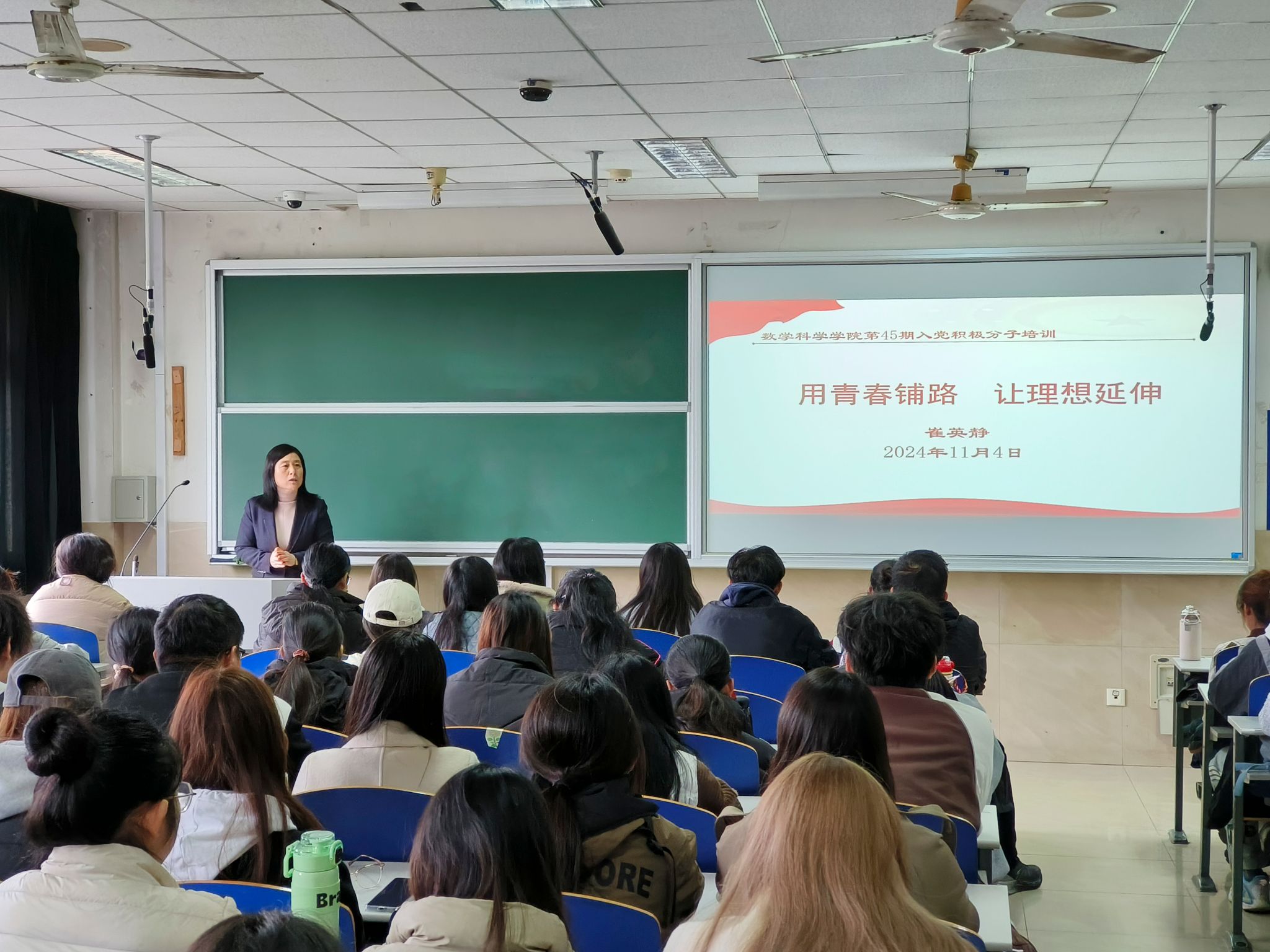 崔英静以发展党员的十六字方针为切入点,引导同学们思考什么是党员,为什么入党,怎样才能成为一名合格的党员。她强调,一要端正入党动机,践行全心全意为人民服务的宗旨;二要坚守为中国人民谋幸福,为中华民族谋复兴的初心使命;三要锤炼优良的学习、生活和工作作风,加强党性修养,在日常学习、工作和生活中,发挥模范带头作用。最后,她勉励同学们自觉加强学习,深入领会党的二十届三中全会的重大意义、总体要求和重大举措,志存高远、脚踏实地,为学校高质量发展贡献青春力量。