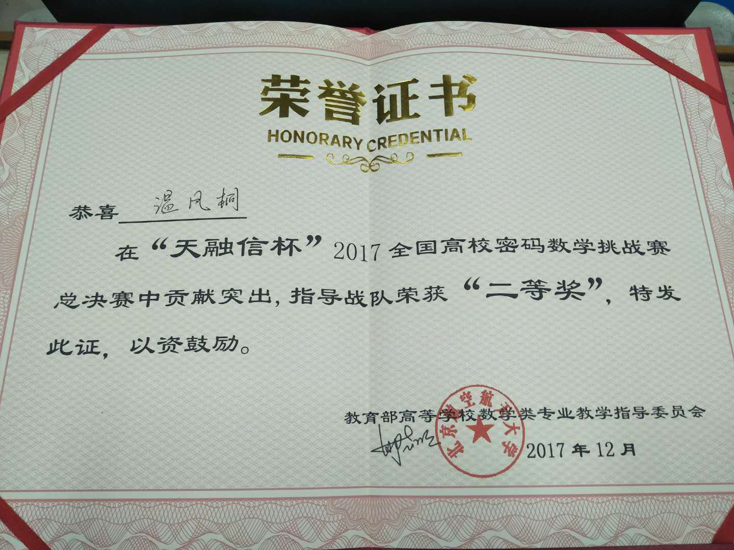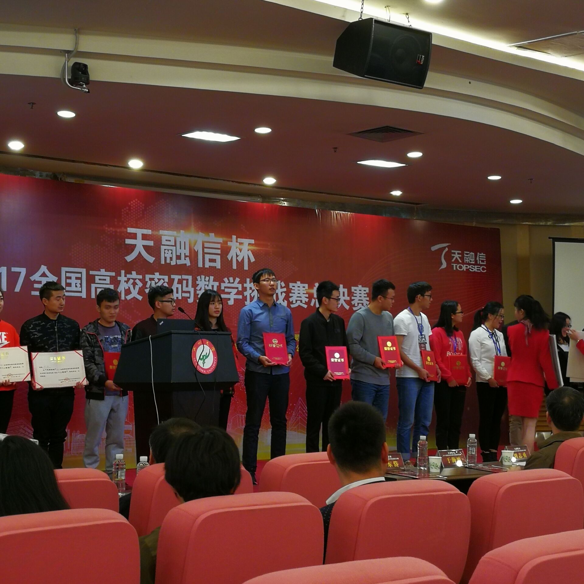 12月3日天融信杯2017年全国高校密码数学挑战赛总决赛颁奖典礼在广州大学隆重召开。我校allwincity万象城大三学生任金波、杨莫难组成的代表队与全国各地著名高校研究生队伍同台竞技,喜获总决赛二等奖,该队由数学院温凤桐老师指导。