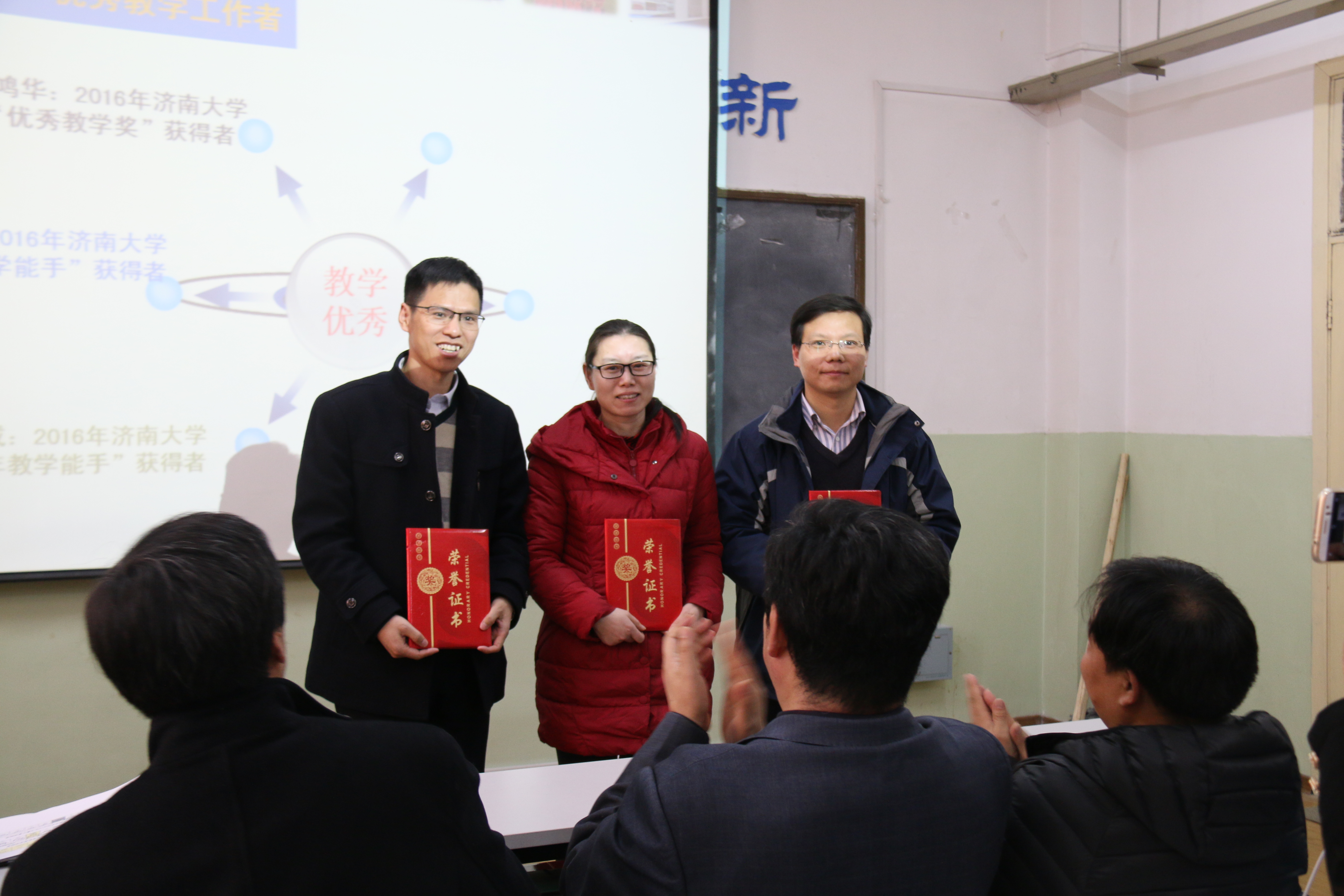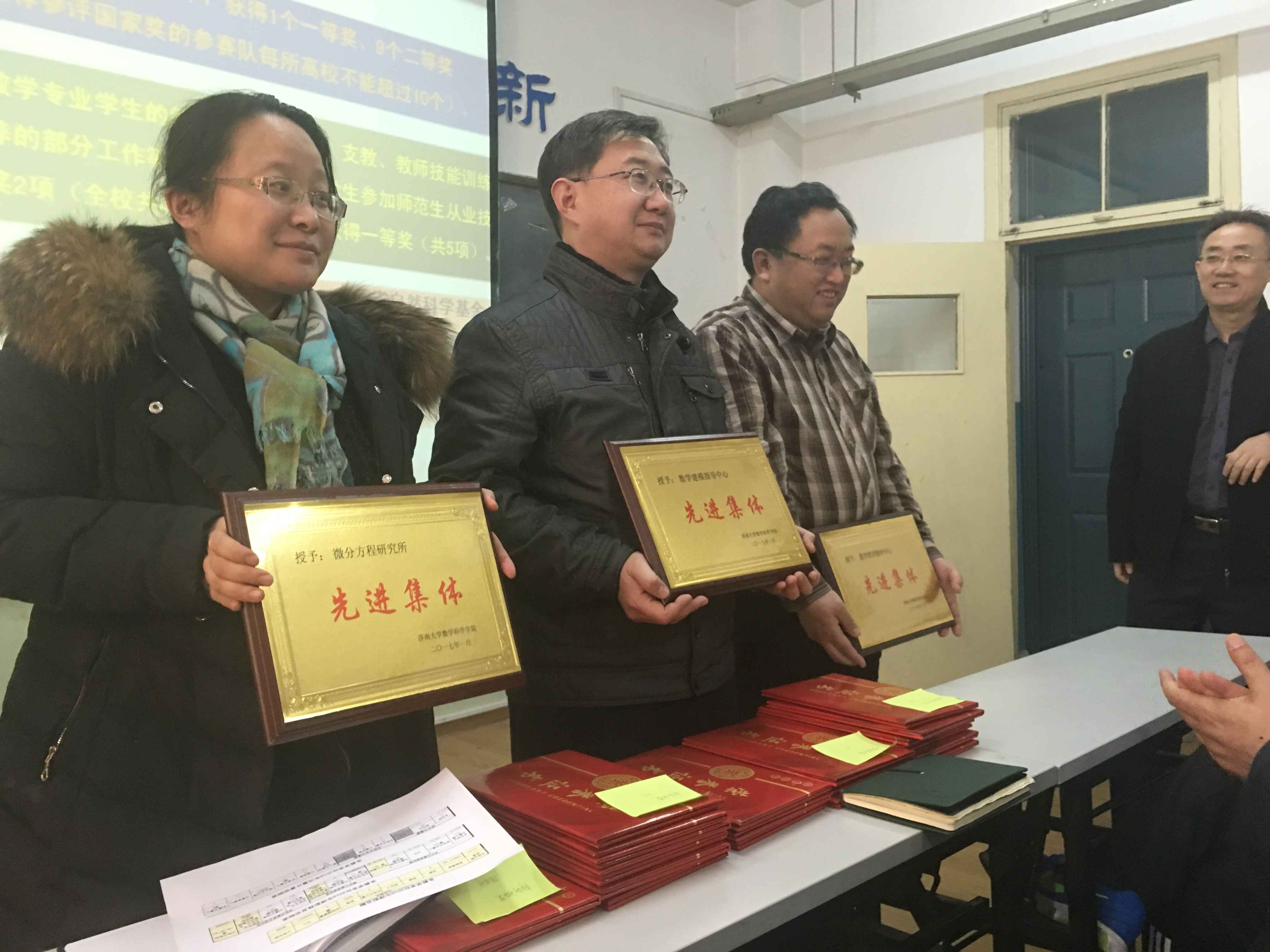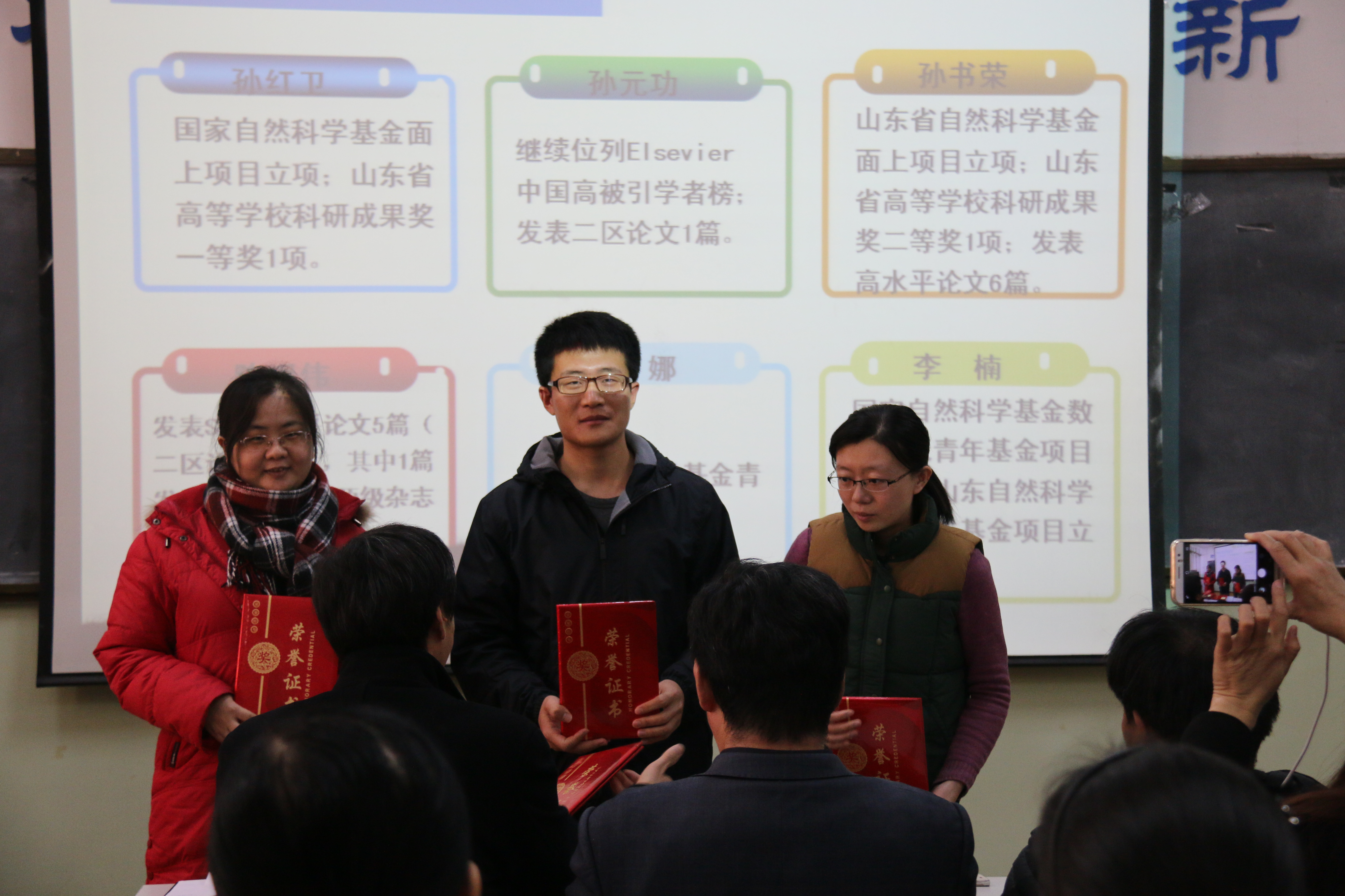 会上,公布了学院2016年十大事件;表彰了数学建模指导中心、数学教育教研中心、微分方程研究所等先进集体;表彰了优秀科研工作者孙红卫、孙元功、孙书荣、陈观伟、张娜、李楠;表彰了优秀教学工作者张苏梅、苗丽安、孙书荣、吴鸿华、王洪凯、宋玉成;表彰了评教优秀的前六名教师吕洪波、祁晓光、张培龙、马 超、吴兆荣、赵 燕;表彰并奖励了班级考研成绩优秀奖的李可峰;表彰并奖励了科创工作开拓奖的徐法升;表彰并奖励了工会活动积极分子马巧灵、刘友谊、赵华磊。