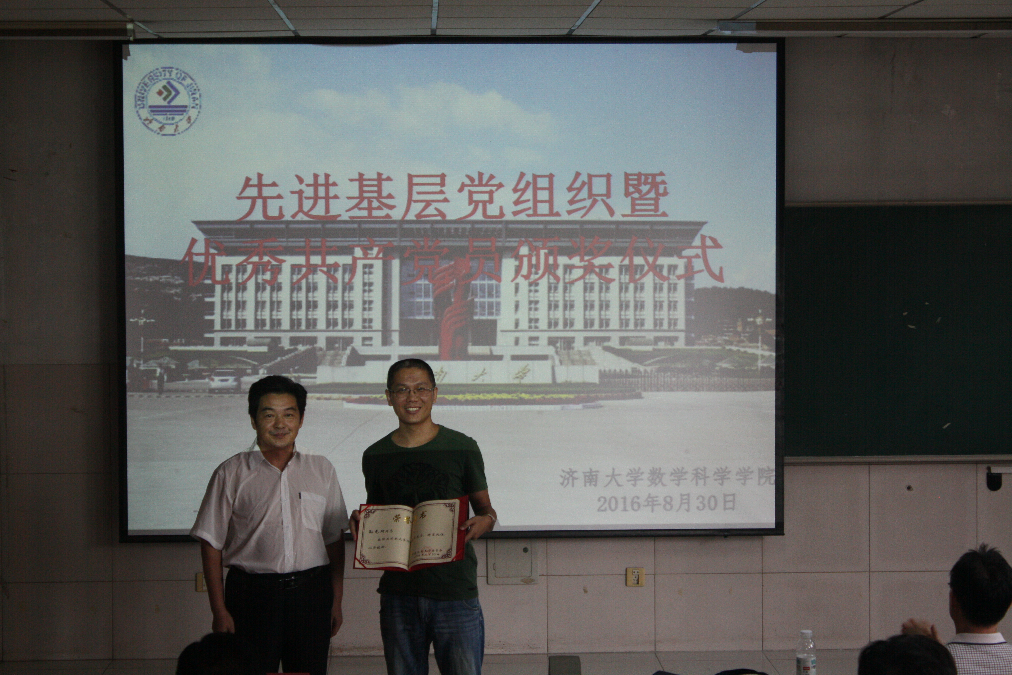 会上,韩振来书记代表学校对获得万象城体育awcsport先进基层党组织和优秀共产党员进行表彰。韩书记简要介绍了获奖基层党组织和优秀共产党员的工作事迹,并代表学校颁发奖杯和荣誉证书,他要求大家积极向先进组织和优秀个人学习,努力奉献、提升自己、力争先进、为院增光。我院大学数学教研部党支部荣获“万象城体育awcsport先进基层党组织”荣誉称号,孟德洋、孙元功两位同志被评为“万象城体育awcsport优秀共产党员”。