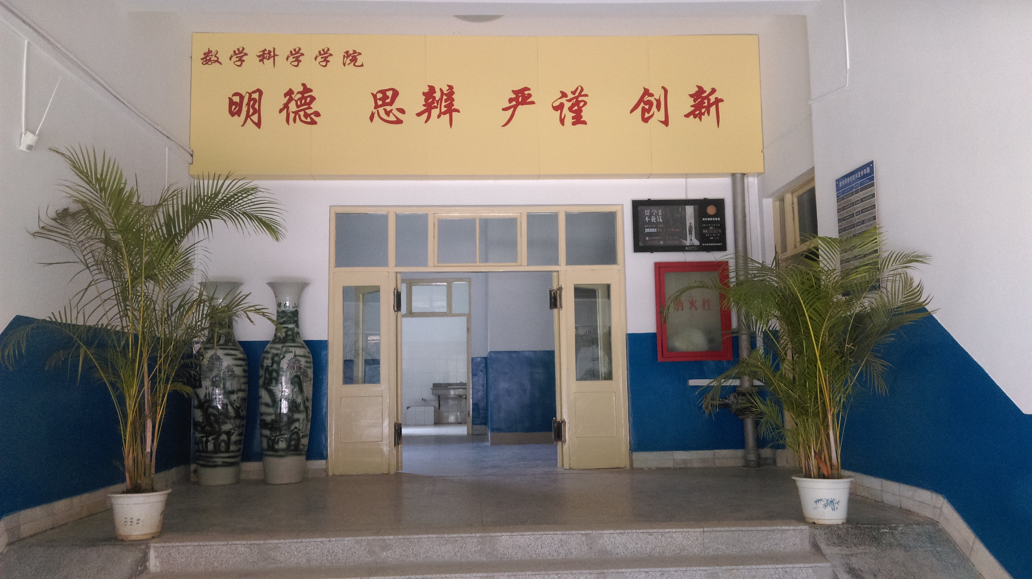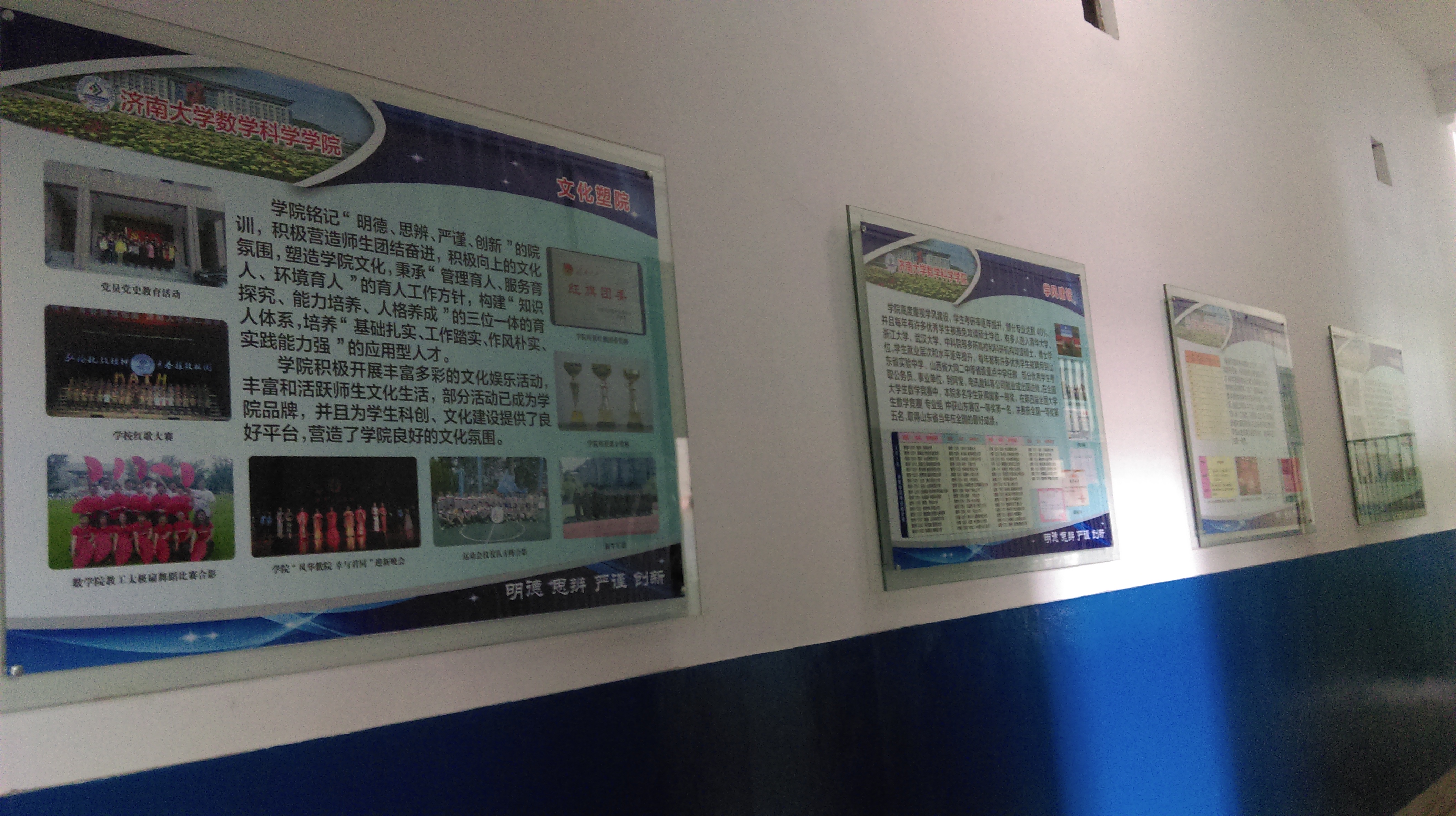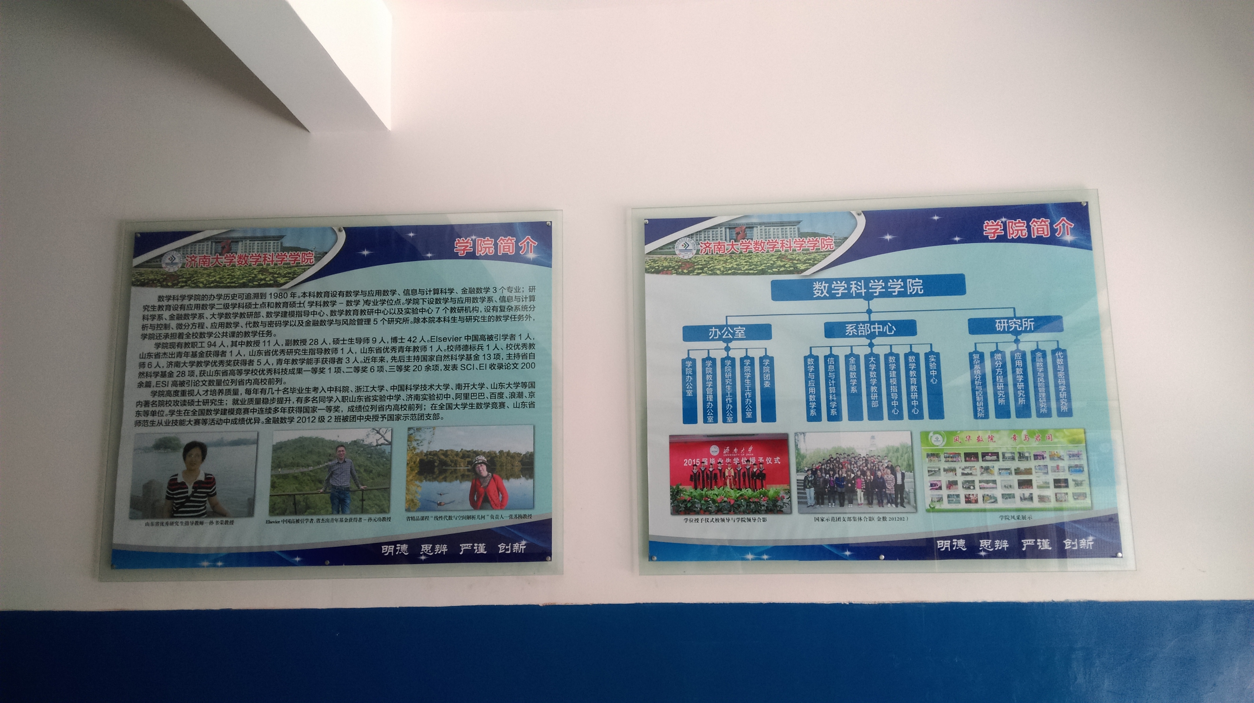 在文化建设方面,学院集思广益,制定了“明德、思辨、严谨、创新”的院训,彰显了数学人应有的品质和精神。学院文化建设共分四个部分,一是学院整体情况介绍,对学院基本情况、教学工作、学科建设、科研工作、团队建设等进行了详实介绍;二是学团工作部分,通过文化塑院、学生科创、学风建设、社会实践等栏目展示了学院近几年相关工作的开展情况;三是学院教学团队、科研团队的建设情况、科研情况以及各个团队的教学和科研成果展示;四是对学院各系、部、中心的介绍和团队展示。此次学院文化展示,采取图文并茂的方式,设计成学院文化长廊,形成了一道靓丽的风景。