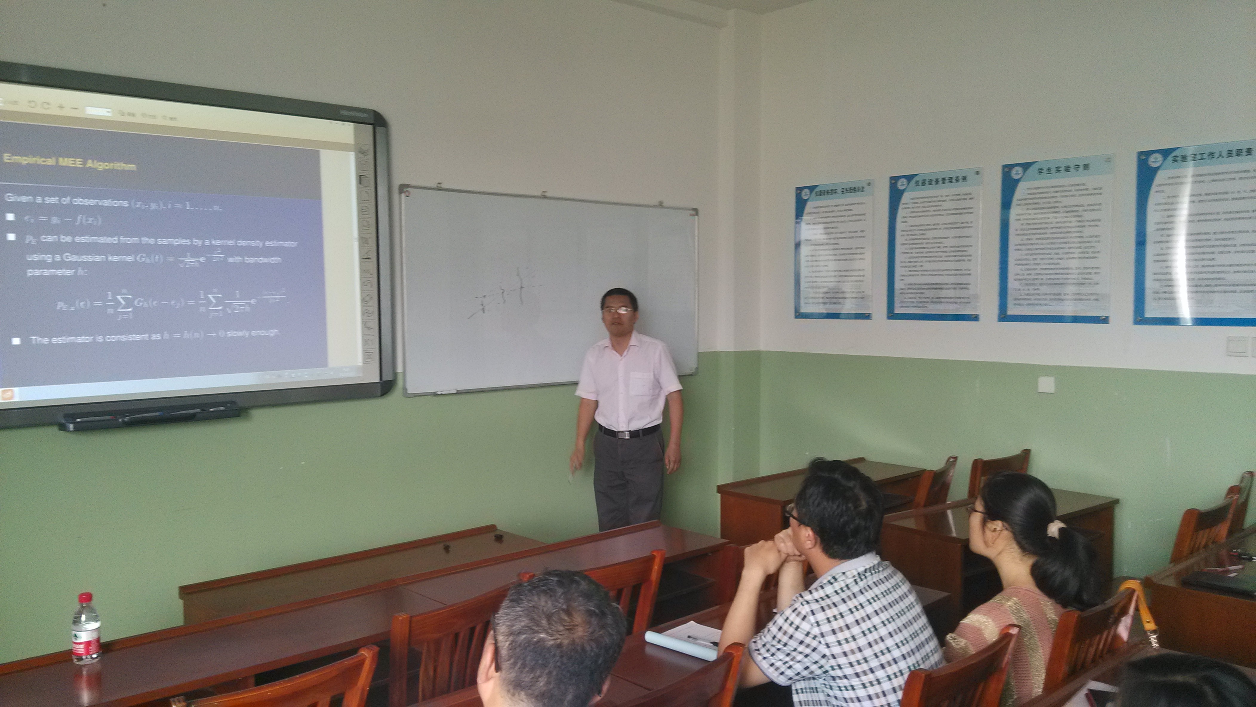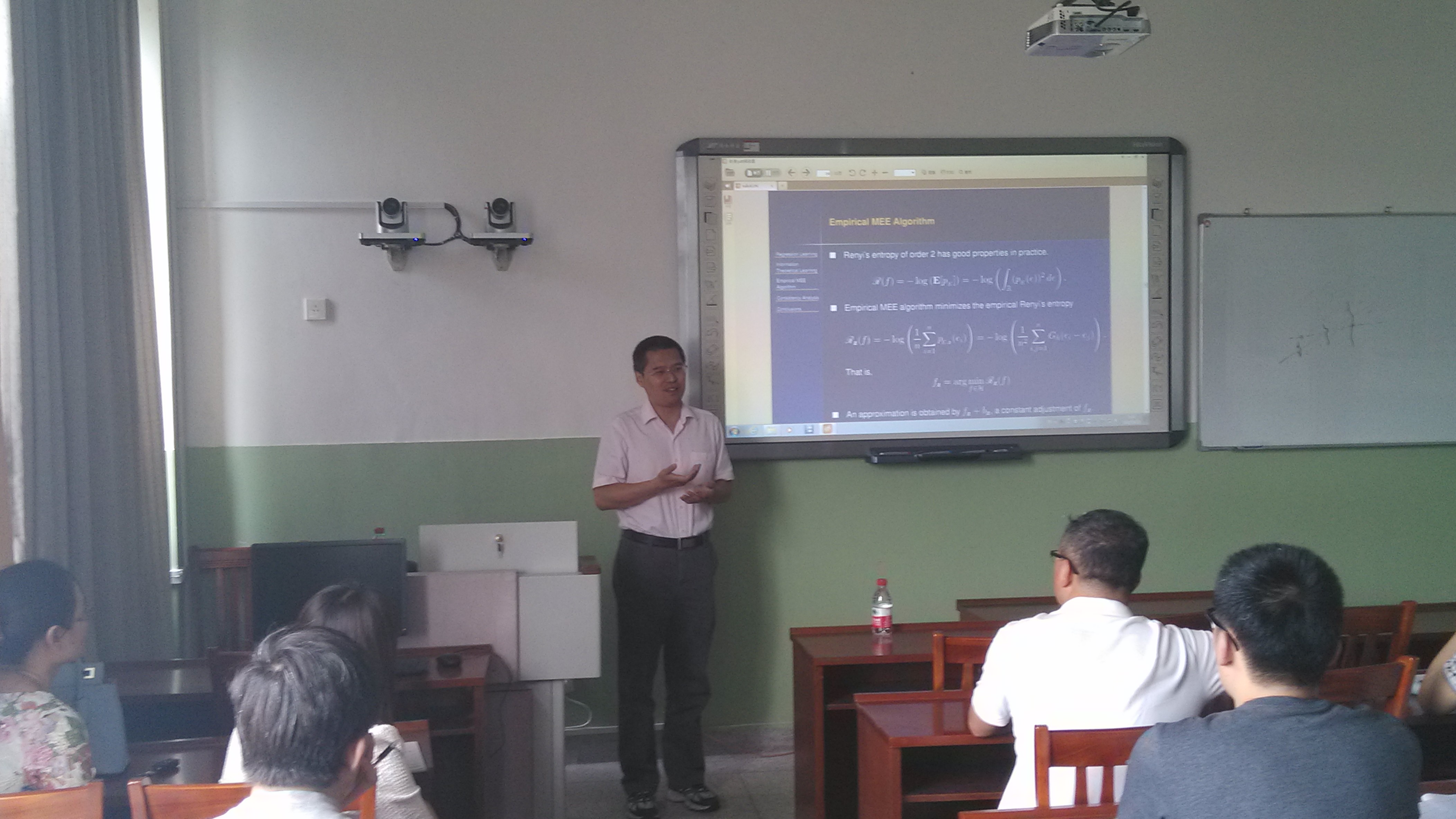吴强博士的报告题目为《Consistency Analysis of the Minimum Error Entropy Algorithm》。报告中,吴强博士详细介绍了回归学习、基于信息论中Shannon熵与Renyi熵的MEE回归算法的由来、以及MEE回归算法的一致性分析,并提出了进一步思考的一些问题。会后,allwincity万象城不确性数学理论科研团队的师生们还就学习理论的一些前沿问题和国外研究现状与吴强博士进行了探讨和交流。
