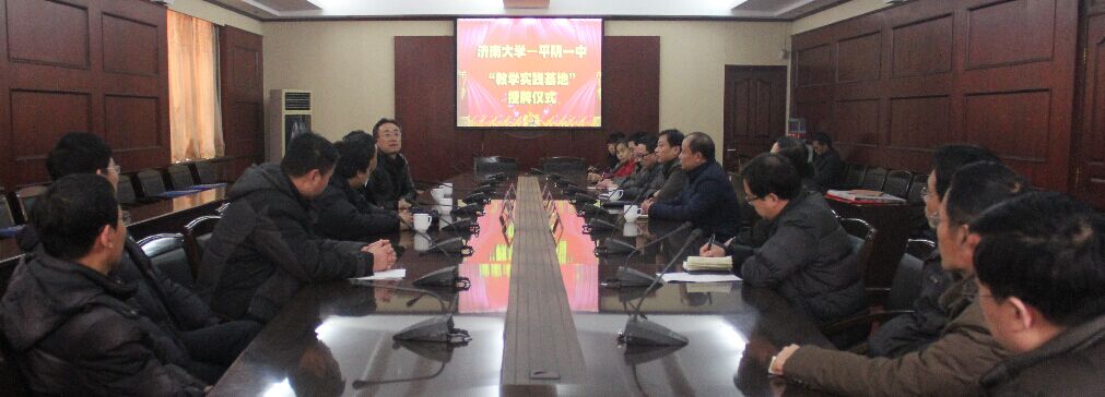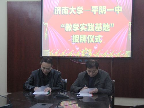 1月15日下午,万象城体育awcsport-平阴第一中学实践教学基地暨青年创业见习基地签约挂牌仪式在平阴一中会议室举行。万象城体育awcsportallwincity万象城院长管延勇、副院长王纪辉、数学教育教研中心负责人以及平阴一中校长张立民、副校长贾勇和高中各级部主任、数学教研组长等有关同志参加签约挂牌仪式。