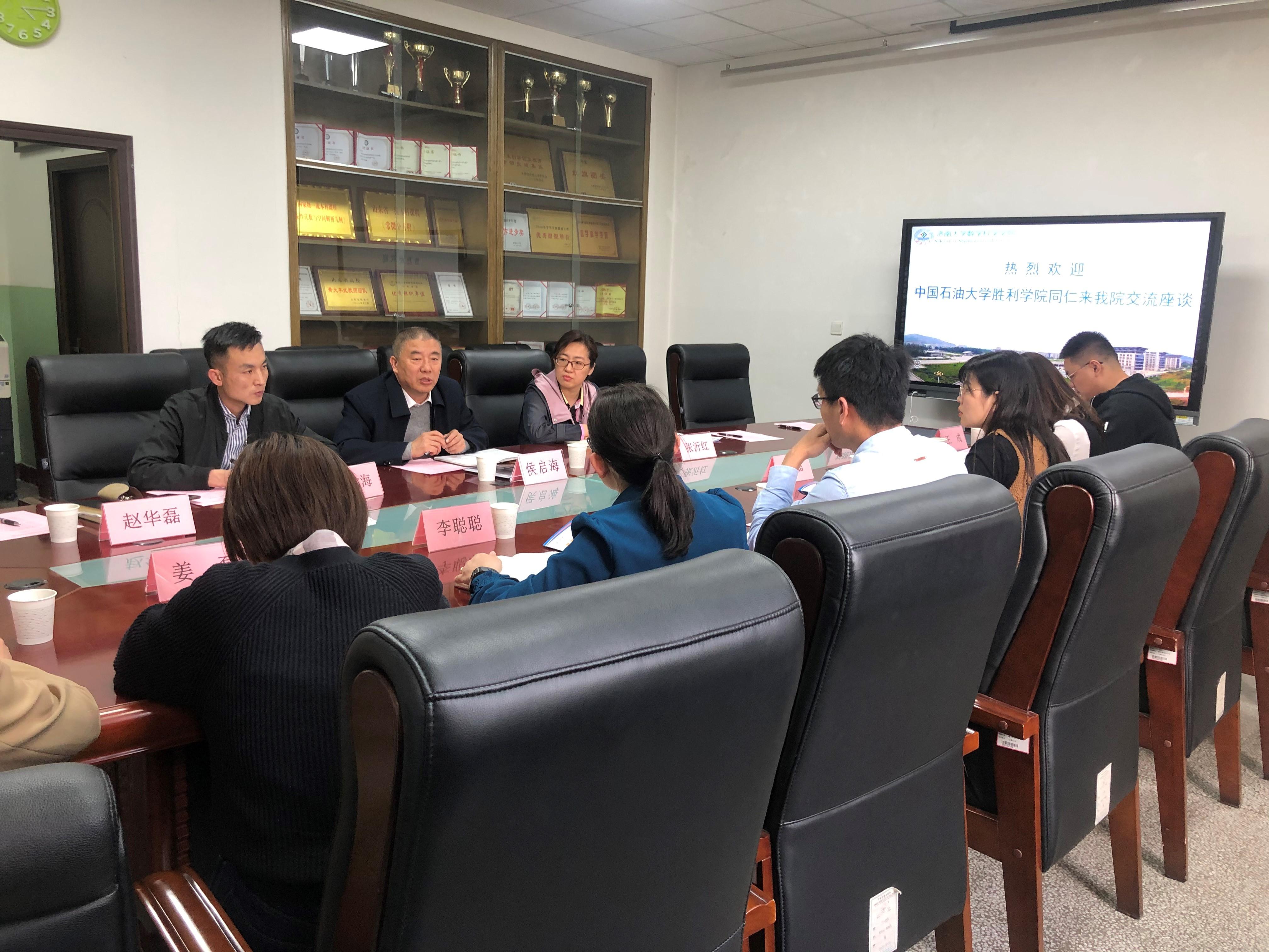 4月15日下午,中国石油大学胜利学院机械控制与工程学院党总支副书记张成明,油气工程学院党总支副书记李聪聪,教育与艺术学院党总支副书记王晶,机械控制与工程学院学工办主任姜磊,油气工程学院学工办主任王成,教育与艺术学院学工办主任胡洪翠,专职辅导员王兆婷一行来我院进行学生工作交流座谈。allwincity万象城党委书记侯启海,allwincity万象城党委副书记、副院长张沂红,团委书记赵华磊以及兄弟学院团委书记、辅导员参加座谈。