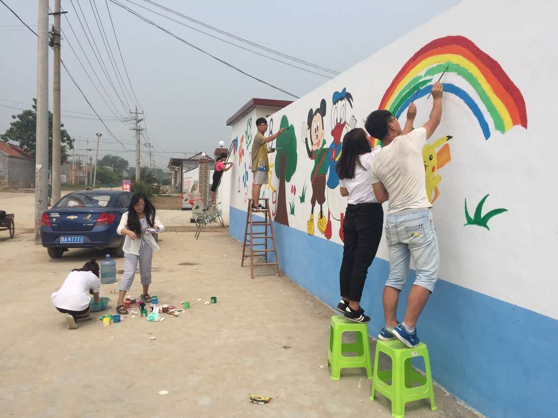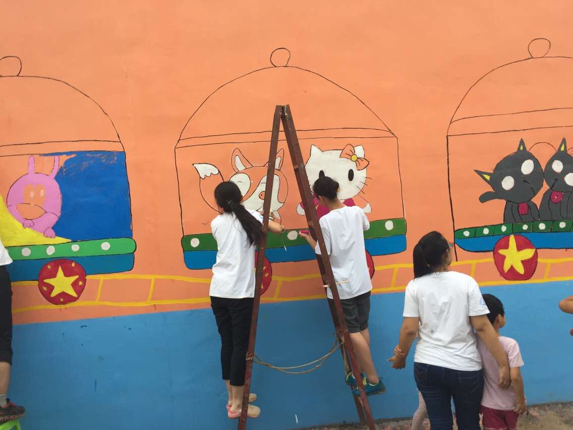 活动伊始,志愿者们用丰富的想象力构思了幼儿园门前的三面墙的图案,采用小朋友们喜欢的动画人物作为墙面的主要内容。志愿者们在村支书的带领下去镇里买了对小朋友无毒无害的丙烯颜料,回到村里,根据设计好的方案开始作画。村内出来玩耍的小朋友们也来帮助我们,一个个可爱的卡通形象和风景呈现在了幼儿园的外墙,幼儿园被志愿者们用画笔装点的缤纷多彩,路过的村民纷纷表示赞扬。
