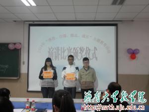 本次比赛共分为选手演讲和评委打分两部分。首先,主持人介绍了到场嘉宾,并宣布了比赛规则。随后,参赛选手们以“感恩自强励志成长”为主题进行了自己的演讲。演讲过程中,选手们充满激情的演讲和精湛的的文笔起了在座人员强烈的情感共鸣,激情澎湃的声音更是让现场掌声雷动,选手们结合自己身边的感恩事例阐述了自己对感恩的理解,拉近了演讲者与观众距离,现场气氛十分融洽。演讲结束后,评委根据选手们的表现进行打分,其中数学1302班刘同飞和韩悦同学凭借着自己慷慨激昂的演讲获得了一等奖的优异成绩。最后,评委们为获奖的同学颁发奖状以示鼓励。