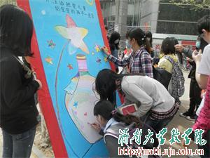 活动伊始,青年志愿者协会展出以“蓝色梦想,关注孤独症儿童”为主题的画板,并为在场的同学提供画笔和折纸,路过的学生在展板上写下自己对孤独症儿童的关爱,或者是在展板的旁边制作着将要送给孤独症儿童的手工星星,温暖的画面传送着小小的爱心。与此同时,青协的成员还准备了口罩,作为小礼品送给在场的爱心人士。随着活动的进行,越来越多的人积极的参与了进来,越来越多的人来排队在画板上绘制下自己对孤独症儿童的祈盼,制作星星的人也把桌子围了一圈又一圈。