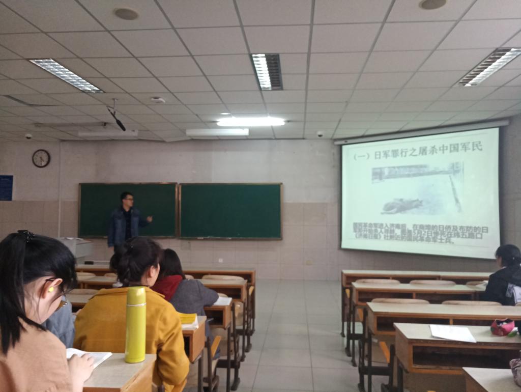 报告会伊始,吴立军老师运用大量的史料向大家详细介绍了“五三惨案”发生的整个过程,并从历史与逻辑两个层面全面分析了惨案发生的历史和现实原因。随后,吴老师通过视频和图片的形式向大家展示了惨案发生时的真实场景,仿佛把大家带回到了那个战火纷飞的年代,也让同学们真切感受到了日本侵略者的残忍面目和泯灭良知的本性。最后,吴老师就如何提升爱国主义素养提出了具体要求。