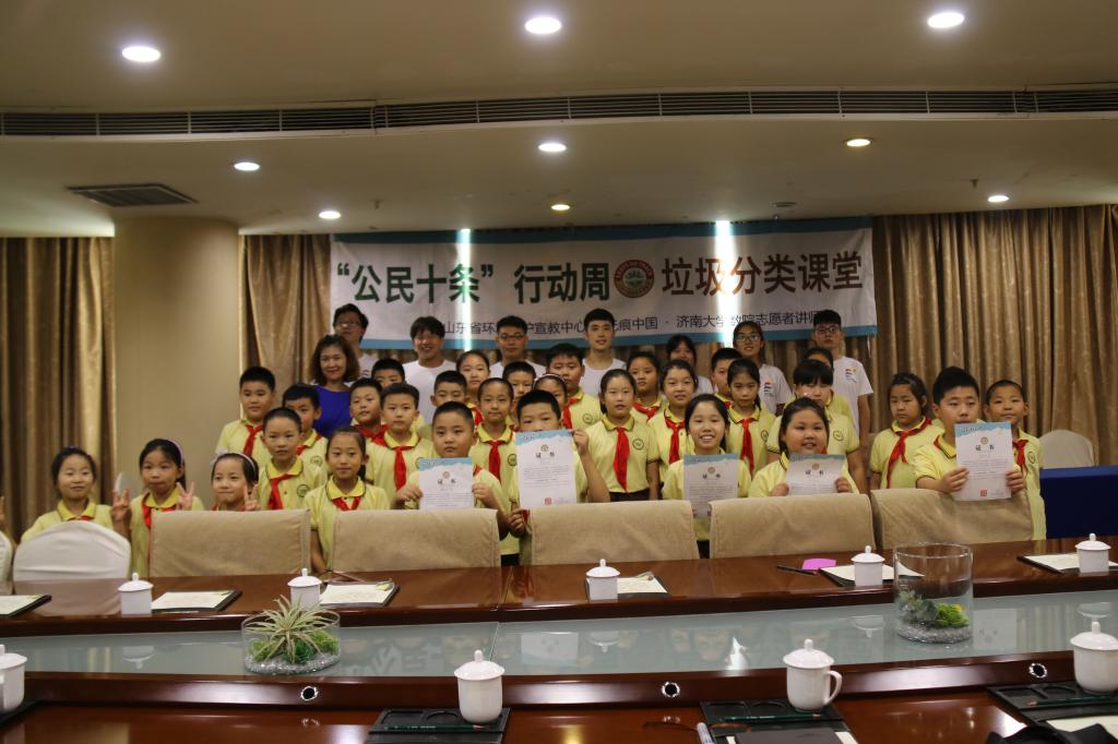 为推动建立健全环境保护机制,深入开展环境爱护宣传教育,在“无痕中国”团队的帮助下,allwincity万象城“无痕济南”暑期社会实践活动正式启动。7月15日,allwincity万象城志愿者们来到了济南市泺新小学和济南市汇贤小学,与小朋友们共同参与《公民十条》垃圾分类环保课堂。