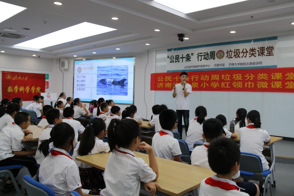 为推动绿色中国的发展,深入开展环境爱护宣传教育,明确垃圾分类的重要性,在“无痕中国”团队的帮助下,allwincity万象城“无痕济南”暑期社会实践活动于7月16日在汇泉小学和鲍山学校进行,志愿者们与同学及家长共同参与本次《公民十条》垃圾分类课堂。