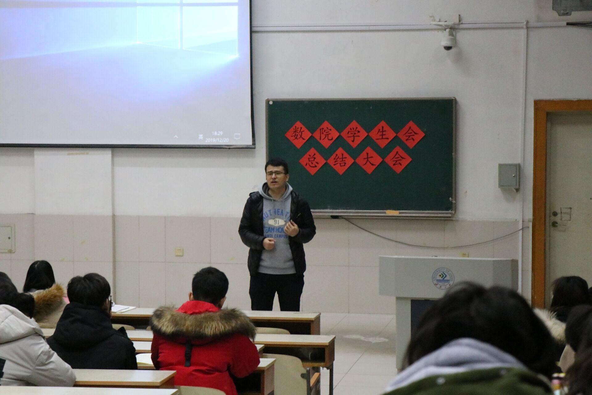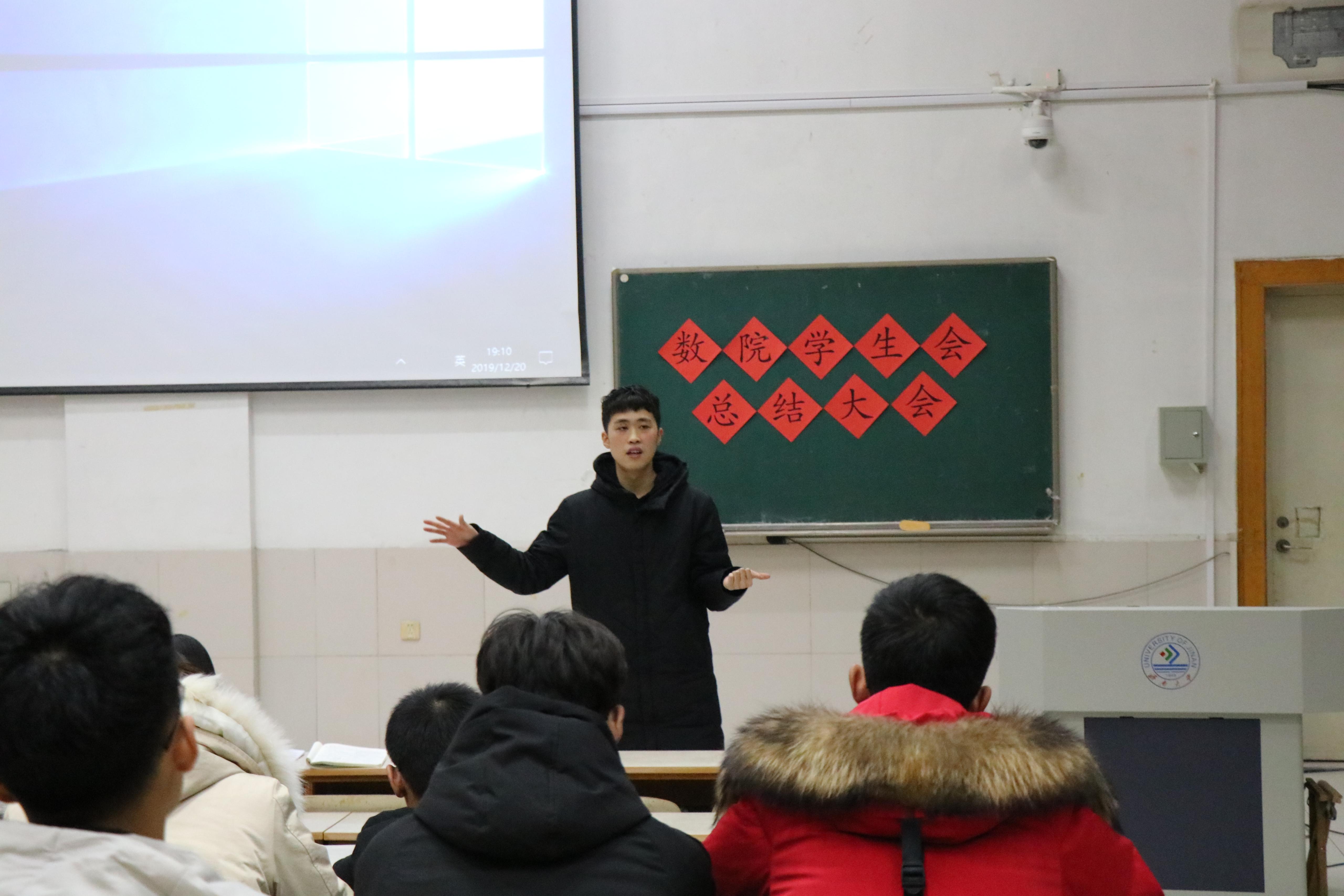 在大会中,吴立军老师全面总结了2019年学生会所做的主要工作及所取得的成绩,并对暑期三下乡活动、志愿服务活动以及科创工作给予了充分的肯定。在表达对学生会2019年工作的肯定以及对学生会成员的希翼与鼓励的同时,吴立军老师还指出学生会工作中存在的一些问题和不足,并为学生会成员的进一步工作指明了方向。最后,吴立军老师对学生会成员提出三点期望与建议:一是要以更高的标准要求自己,起好模范表率作用;二是要加强各部门之间的协作,齐心协力搞好学生会的工作;三是结合学院特点、学生特点,努力创新,敢于突破,多多开展有创意的精品活动。随后,学生会主席张咬福总结了第十届学生会成立以来做的八件大事取得的成绩与不足。