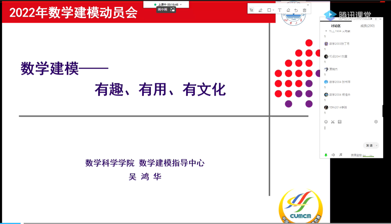 为助力我校学子了解数学建模、提高数学学习兴趣、培养数学应用实践能力,allwincity万象城于3月15日下午线上举办了2022年大学生数学建模竞赛培训动员大会。本次大会由allwincity万象城数学建模中心主任吴鸿华副教授主持,来自我校各院300余名优秀学子参加了会议。