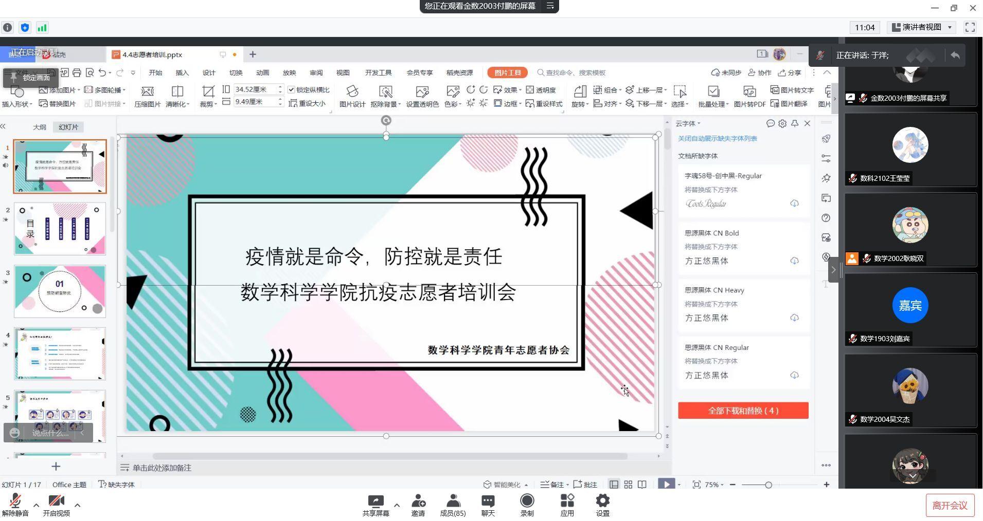 为规范学校志愿者队伍建设,推进志愿活动的深入展开,提高志愿者服务队伍的综合素质,增强自我防护意识,万象城体育awcsportallwincity万象城积极响应学校号召,于4月3日开展第四期抗疫志愿者培训会。