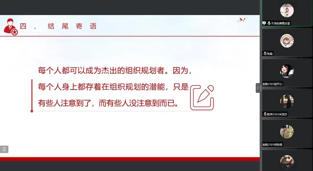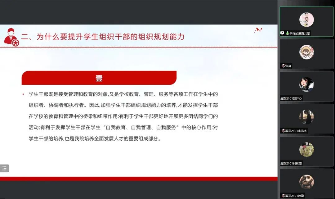 于洋老师首先分析了学生会的性质和宗旨,说明了提升组织规划能力对个人、对集体的重要意义。她从工作科学规范化与细致化、提高统筹规划能力两个方面展开,强调了工作计划、合理分配、统筹意见的重要性,培养大家协调人际关系、组织关系、供求关系等能力,从而增强学生组织的凝聚力和团结性。同时指出制定方案需体现可能出现的意外情况以及解决办法,并提出工作重点、工作目标对于学生组织工作的重要意义。“每个人都可以成为杰出的组织规划者,每个人身上都存在着组织规划的潜能。”于洋老师鼓励大家激发潜能,提升自我。