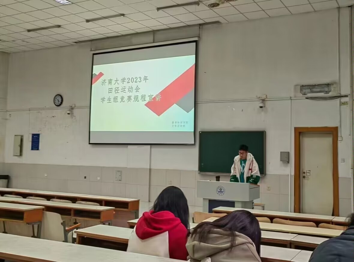 在宣讲会上,文体部部长为大家介绍了有关运动会的报名和比赛流程。运动会的比赛项目主要分为田赛和径赛,其中,各项比赛均按成绩录取前八名。除此之外,运动会还设有青春活力大学生健身操表演赛。由学院选出一支20人的代表队,表演同学身着统一服装,双手持花球,参加运动会开幕式大型学生啦啦操表演,最后按照成绩在运动会闭幕式时对健身操比赛团体颁奖。接着,宣讲人详细介绍了比赛的奖项荣誉及各加分事项,进一步激发了同学们争取个人成就和学院荣誉的斗志。另外,宣讲人还结合社会、国家等多方面因素向同学们一一阐释了运动会的重要价值。体育运动,是学校培养德、智、体、美全面发展一代新人不可缺少的重要内容。现代体育运动的意义早已超出了强身健体的范畴,更重要的是可以培养强烈的爱国主义情感、集体主义精神和自强不息、坚韧不拔的意志,可以增强民族自信心和自豪感、振奋民族精神。最后,部长向同学们介绍了运动会的具体报名方式,强调了报名时间截至4月15日中午12点,并且欢迎同学们扫描二维码,进入群聊,向对应的负责人报名。