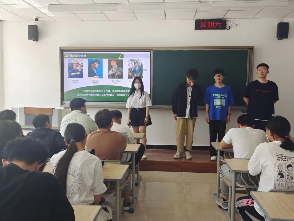 “思想道德与法治”课程在教学周第11周安排了“职业生活中的道德规范”单元教学,并给大一全体学生讲授和传达了如何树立正确的劳动观、择业观和创业观,并介绍“劳模精神”的典范模范,“蓝领专家”孔祥瑞、“金牌工人”窦铁成、“新时代雷锋”徐虎、“知识工人”邓建军等劳动模范。弘扬劳模精神、劳动精神、工匠精神,引发学生思考和讨论。学生学习了劳动模范的榜样人物,感悟了劳模精神的精髓。