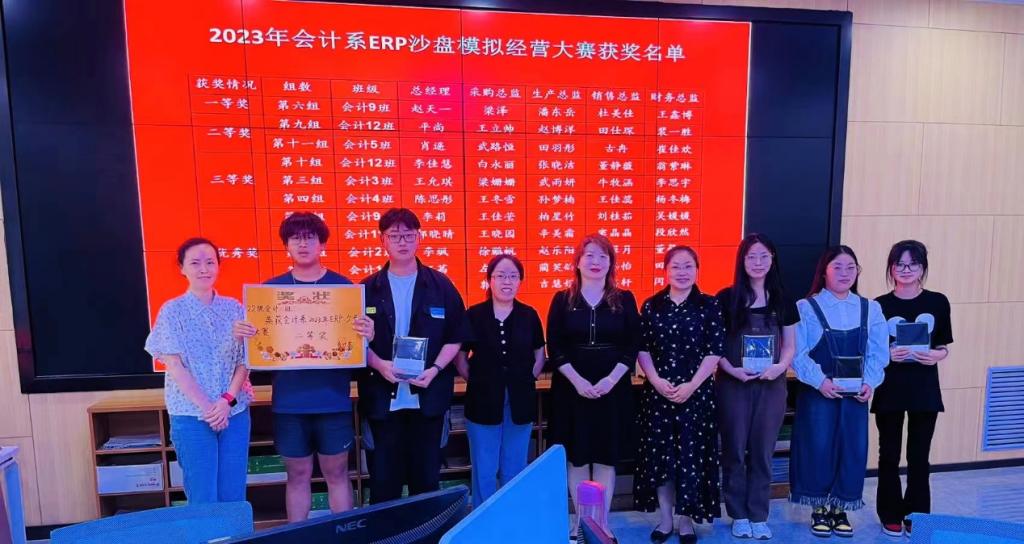 本次活动由会计信息管理教研室协同会计信息化社团共同策划,会计系领导高度重视,姜明霞老师亲临指导,刘轶卿老师全程组织、解疑答惑。专业课程组老师靳添婷、高红卫参加。学生们踊跃报名,来自不同班级的11个团队积极参赛,勇于创新。经过激烈的角逐,进入前6强的团队分别获得一、二、三等奖。
