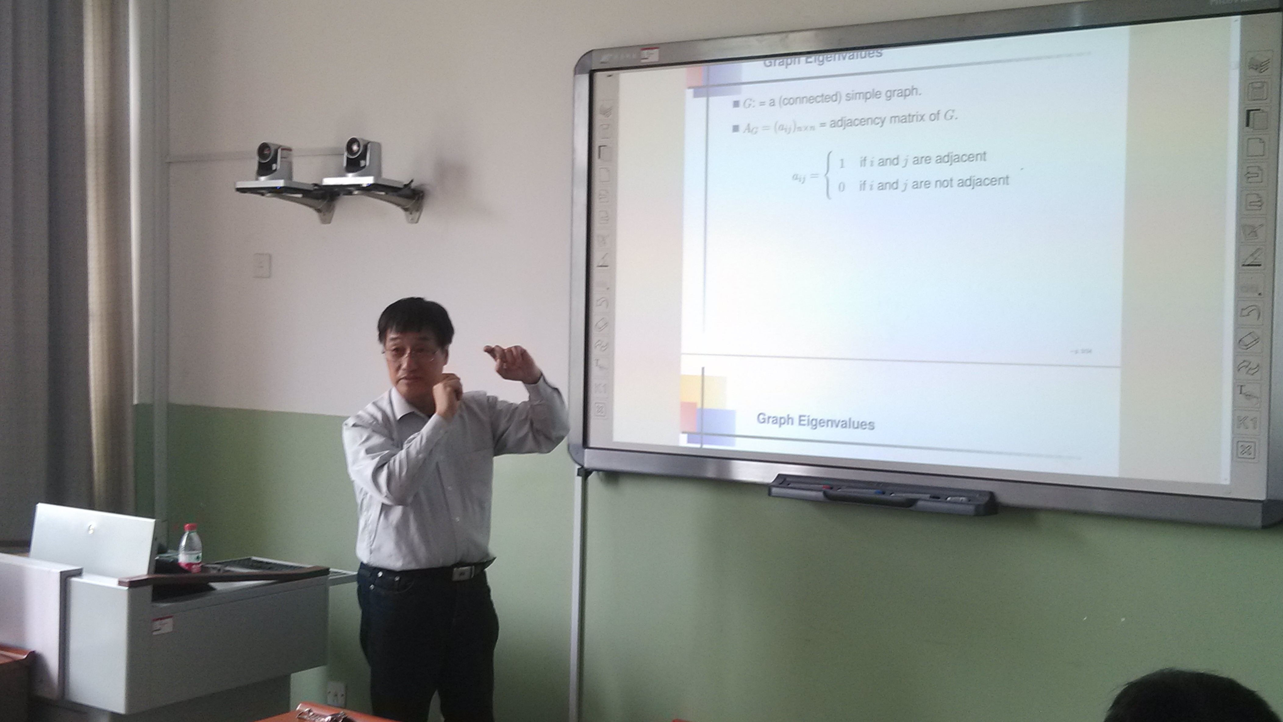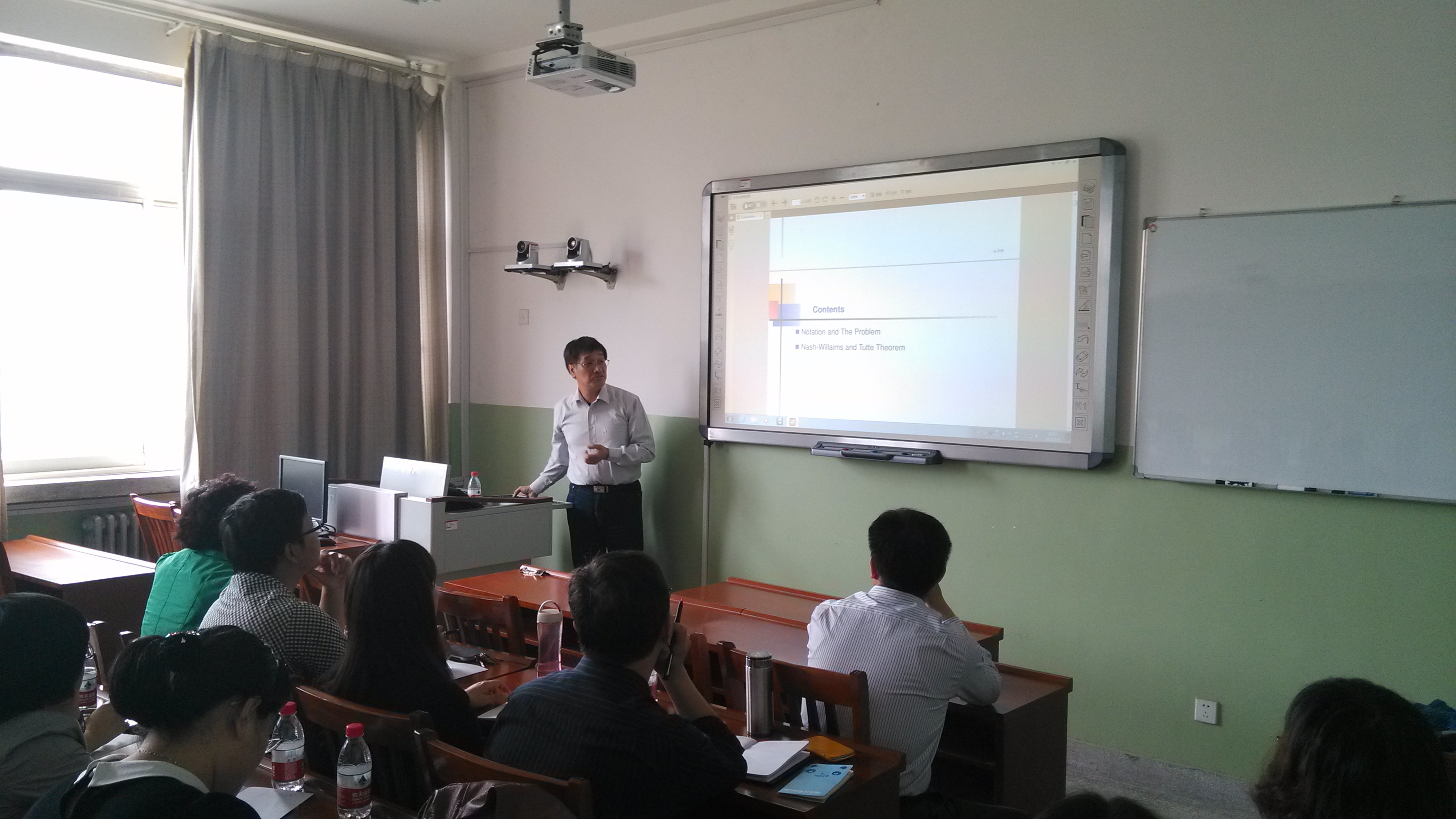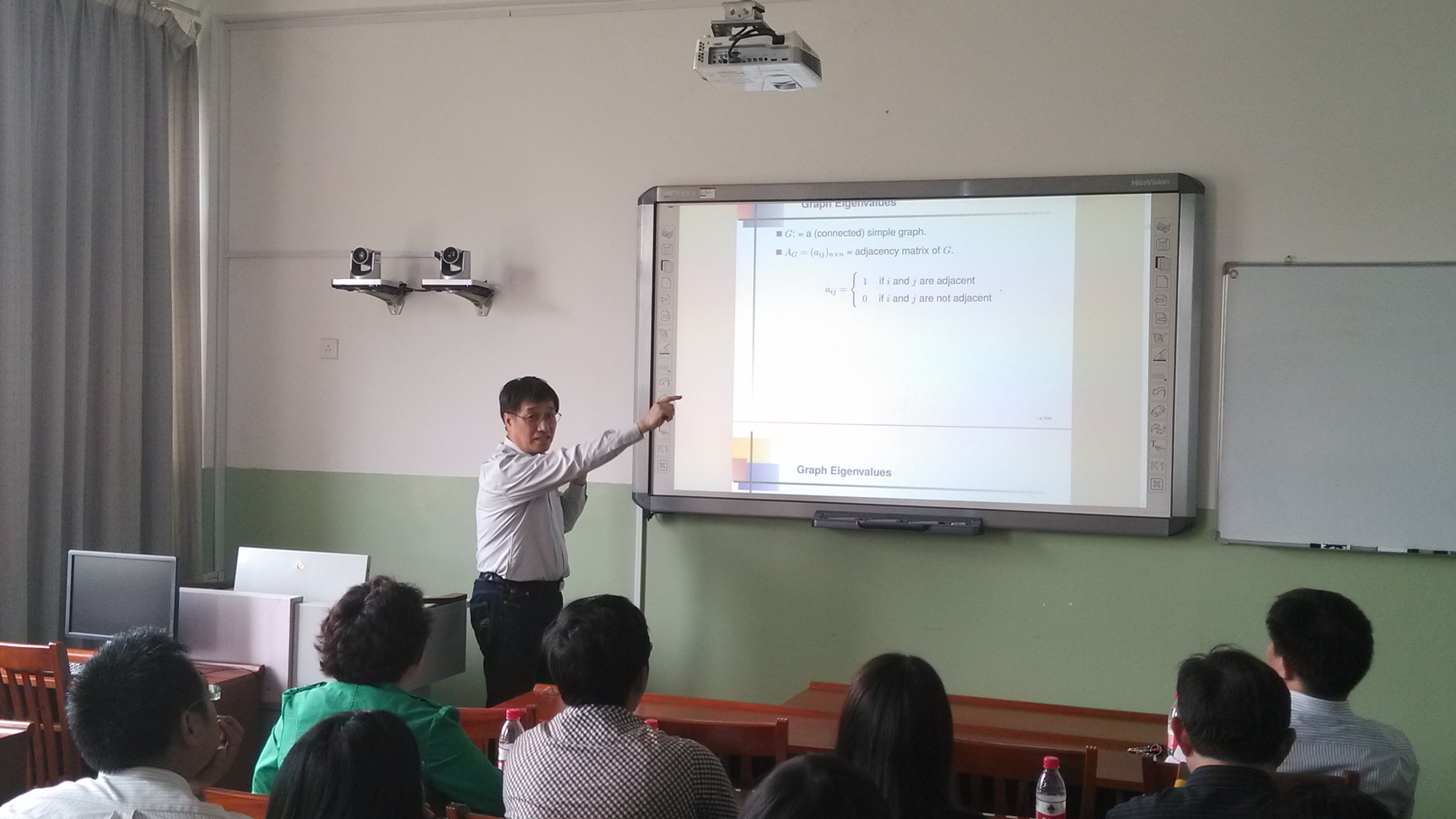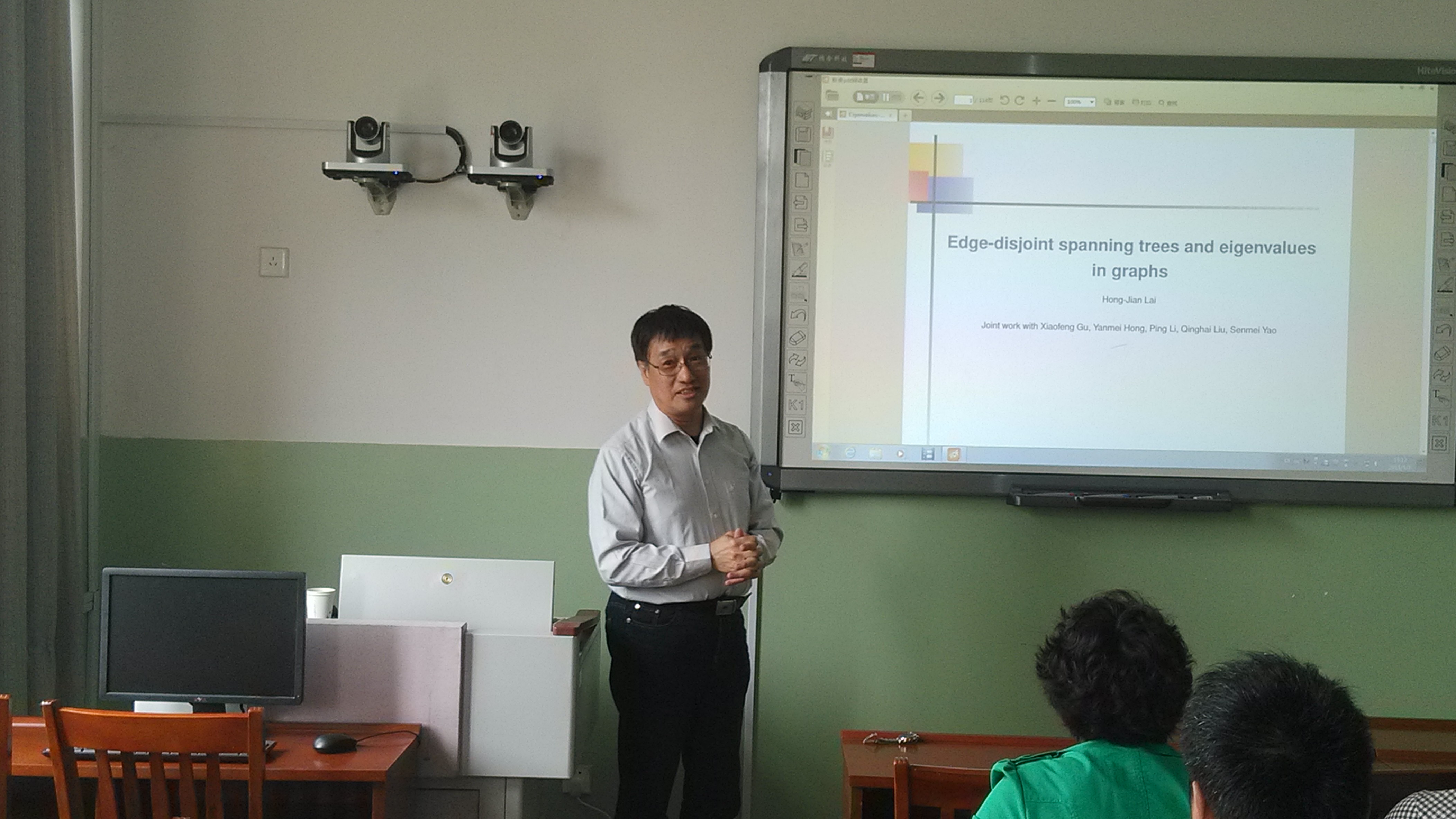 报告会上,赖虹建教授做了《图的边不交的支撑树与特征值》的报告。赖虹建教授从“图的边不交支撑树的个数与邻接矩阵特征值之间关系”的一个猜想出发,介绍了图的邻接矩阵、拉普拉斯矩阵和无符号拉普拉斯矩阵的概念和相关组合、代数方法,详细讲解了问题的研究思路和主要结果,并提出了进一步思考的一些问题。会后,allwincity万象城图论与组合优化科研团队的师生们还就组合图论的一些前沿问题和国外研究现状与赖虹建教授进行了探讨和交流。