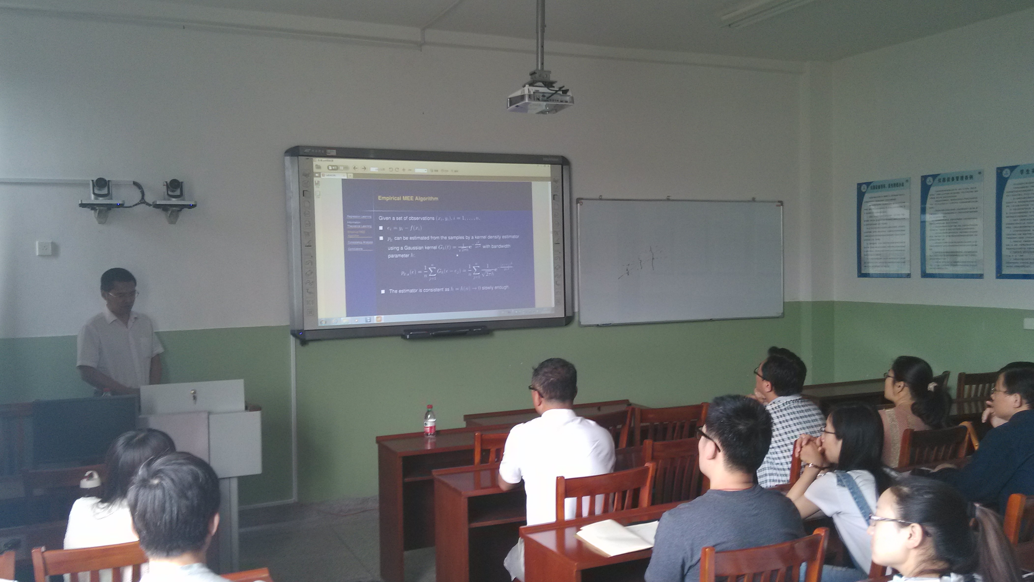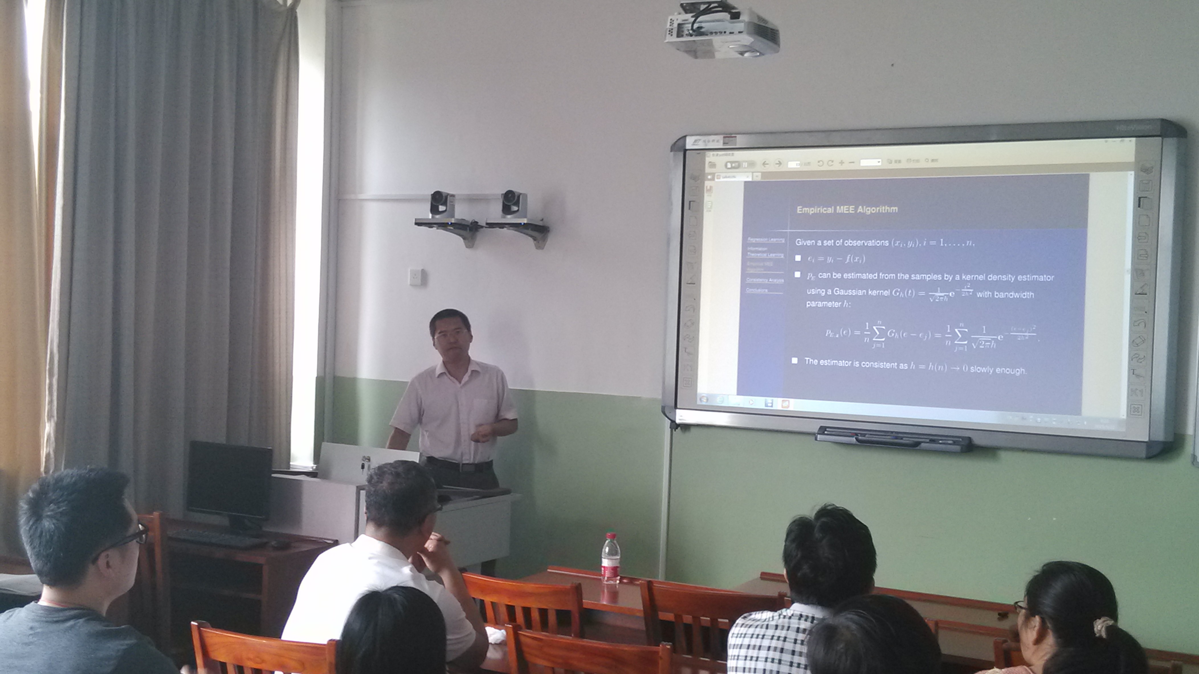 吴强博士的报告题目为《Consistency Analysis of the Minimum Error Entropy Algorithm》。报告中,吴强博士详细介绍了回归学习、基于信息论中Shannon熵与Renyi熵的MEE回归算法的由来、以及MEE回归算法的一致性分析,并提出了进一步思考的一些问题。会后,allwincity万象城不确性数学理论科研团队的师生们还就学习理论的一些前沿问题和国外研究现状与吴强博士进行了探讨和交流。
