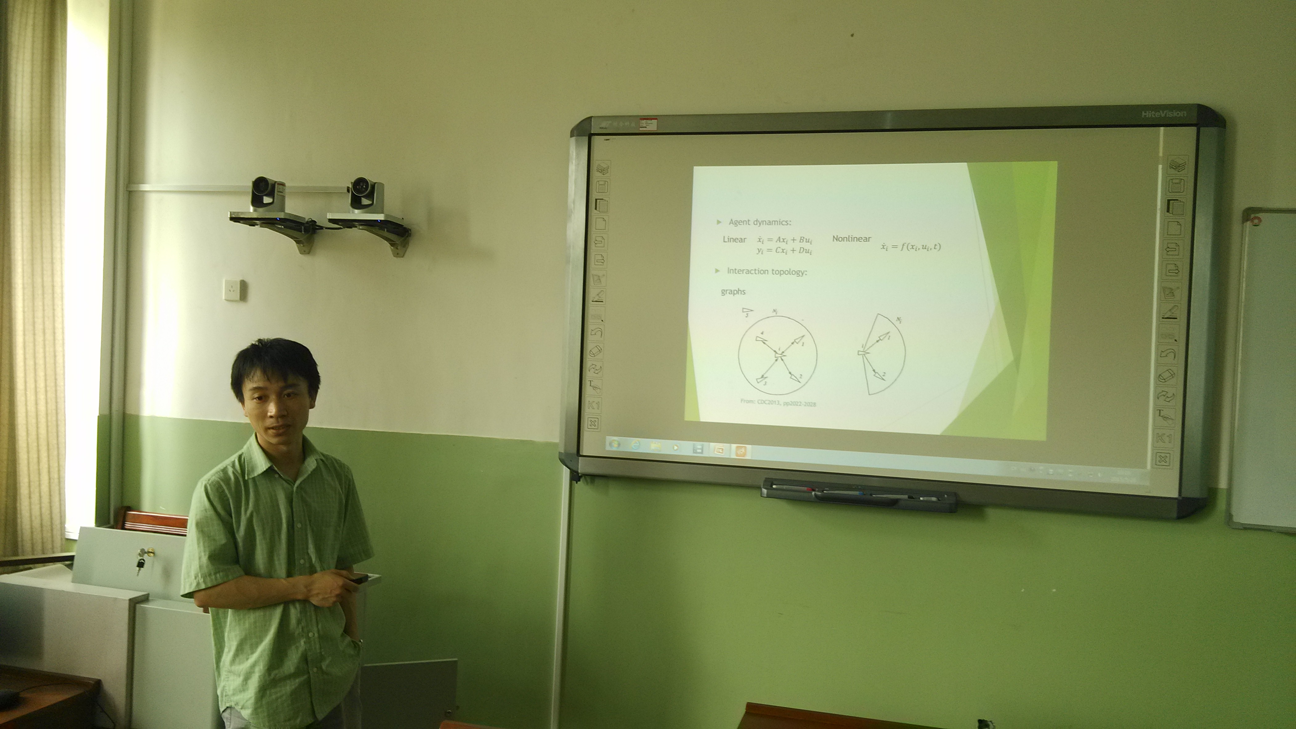报告会上,肖峰教授从多智能体系统的工程背景入手,介绍了多智能体系统分布式协同控制的相关概念和发展概况,提出了多智能体系统基于边异步数据采样的一致性问题,详细阐明了解决该问题的主要思想和研究思路,并提出了进一步研究的科学问题。会后,复杂系统分析与控制团队的师生们还就报告中的相关问题和多智能体系统的国内外研究现状和趋势与肖峰教授进行了探讨和交流。