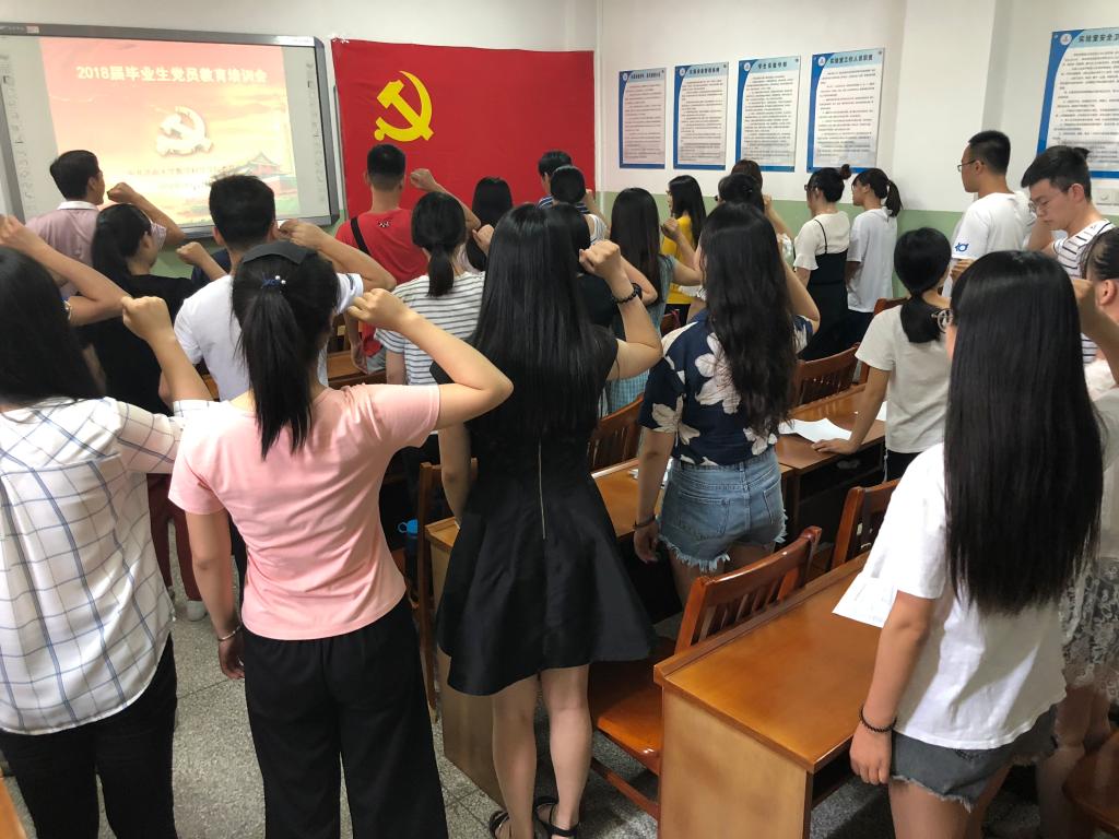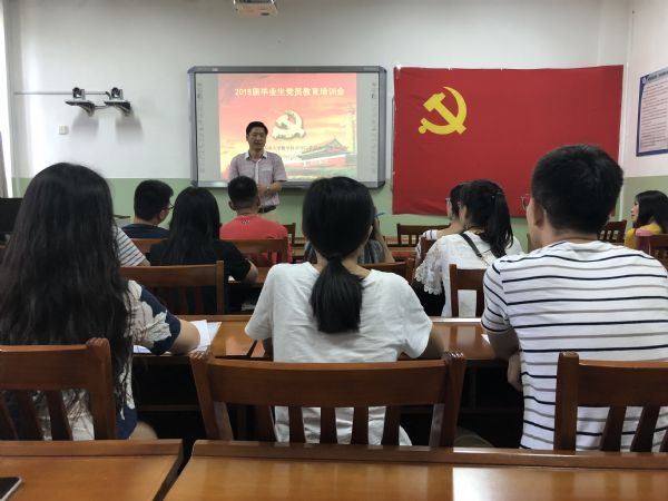 教育培训会由四个环节组成。首先,由韩书记带领毕业生党员重温入党誓词,同学们对着党旗,再次许下了铮铮誓言。之后,韩书记就同学们的毕业后发展方向,在校期间的党员素质培养,牢记习总书记教诲等三方面进行授课,并带领大家深入学习了习总书记在北京大学师生座谈会上的讲话。最后,韩书记用习总书记的话进行总结,并为同学们提出了四点要求:立国,立志,求真,立行。之后,孟书记就毕业生党员注意事项进行授课,他对毕业生党员应尽的义务,应承担的责任进行了深入剖析,并鼓励同学们踏实走好脚下的路。最后,由赵华磊老师组织开展主题党日教育:感恩母校,文明离校。她要求同学们在文明离校过程中发挥党员榜样示范作用,在走向社会后,继续秉承“弘毅 博学 求真 至善”的校训,为党旗添彩,为母校增光。