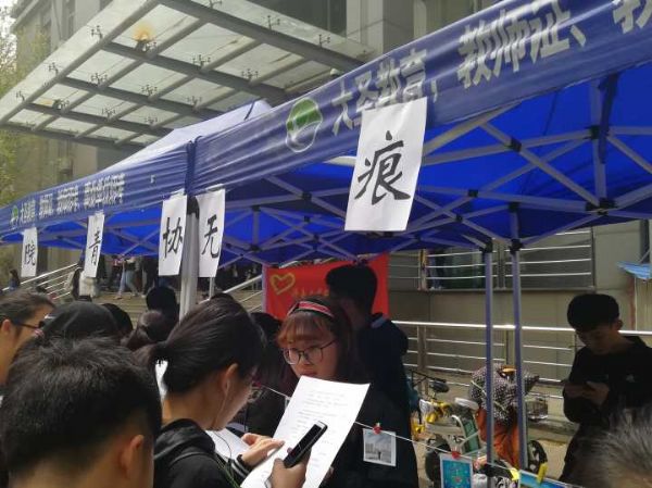 活动一开始,就吸引了众多同学前来围观,积极的参与“火眼金睛”、“环保大比拼”以及“我想对你说”等各项活动。在“火眼金睛”和“环保大比拼”活动中,志愿者们出示花、鸟图片和关于环保知识的题目,参与者们作答,答题结束后由专门人员对图片内容做简略介绍,并赢得相应的奖品。这些活动不仅让同学们了解更多的自然知识,亲近大自然,感受自然之美,更能增强大家保护环境的意识,提高同学们的环保素养。参与者还号召同学们参与到“我想对你说”活动中,在环境污染的照片上写下自己对于环保的建议,自己认识的无痕理念和自己的环保小心愿,这个活动得到了大家的积极响应,一张张的小卡片纷纷挂起,每位参与的同学还获得了小奖品作为奖励。