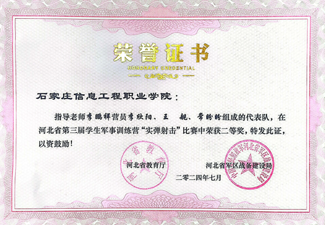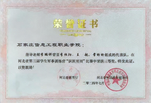 近日,河北省第三届学生军事训练营在石家庄市民兵训练基地举行。经过激烈角逐,由基础部教师李鹏祥指导,软件工程系李欣阳、机电工程系王舰和常盼盼3名学生组成的学院代表队荣获团体二等奖,单项比赛获国防知识、实弹射击、战场医疗救护3个项目二等奖,识图用图1个项目三等奖,李欣阳同学被评为优秀营员。