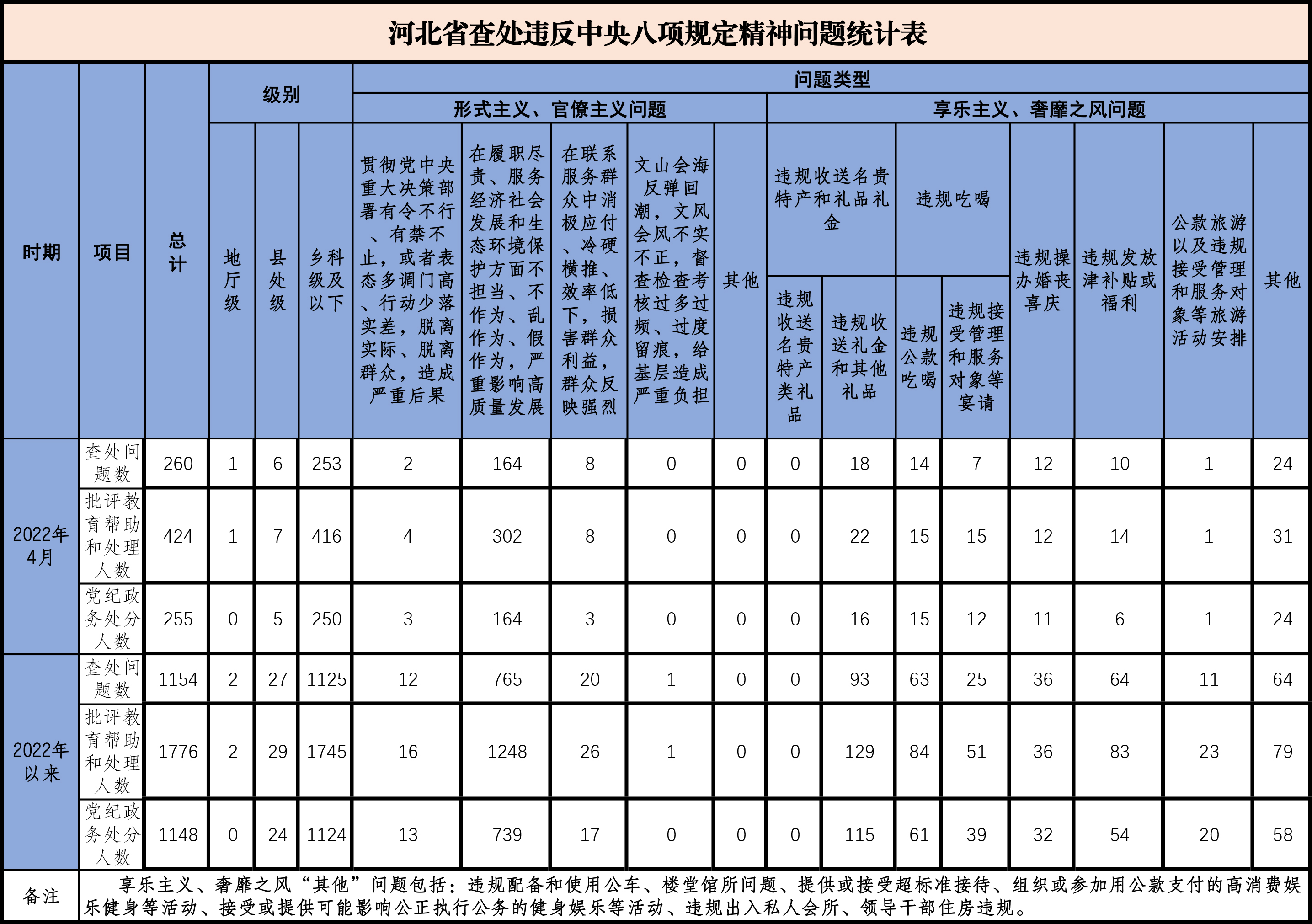 2022年4月,全省各级纪检监察机关共查处违反中央八项规定精神问题260起,批评教育帮助和处理424人,其中党纪政务处分255人。