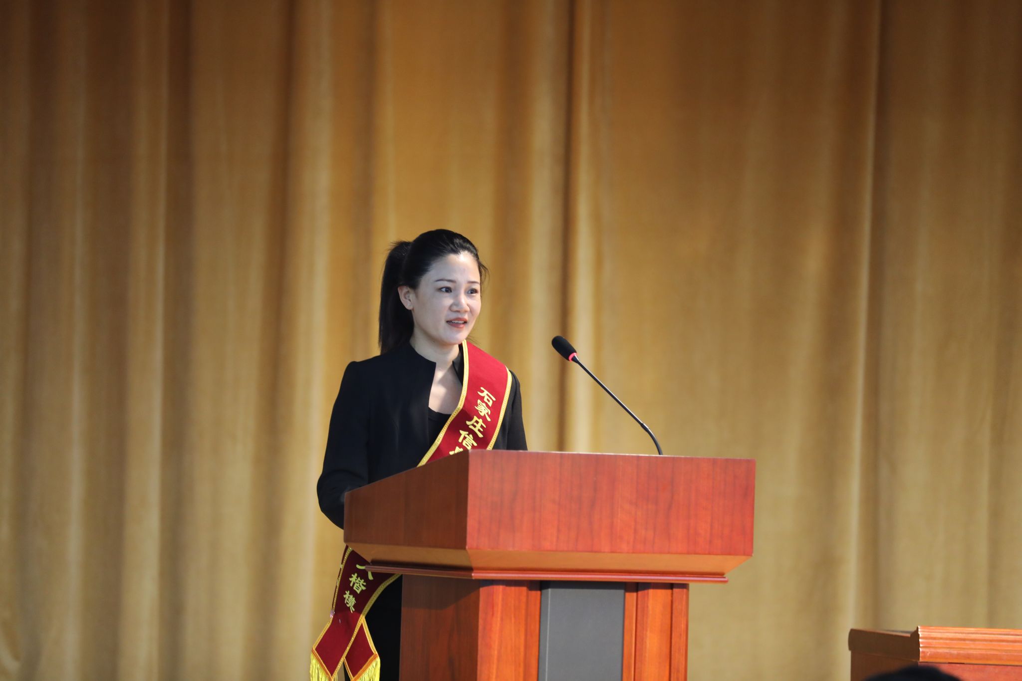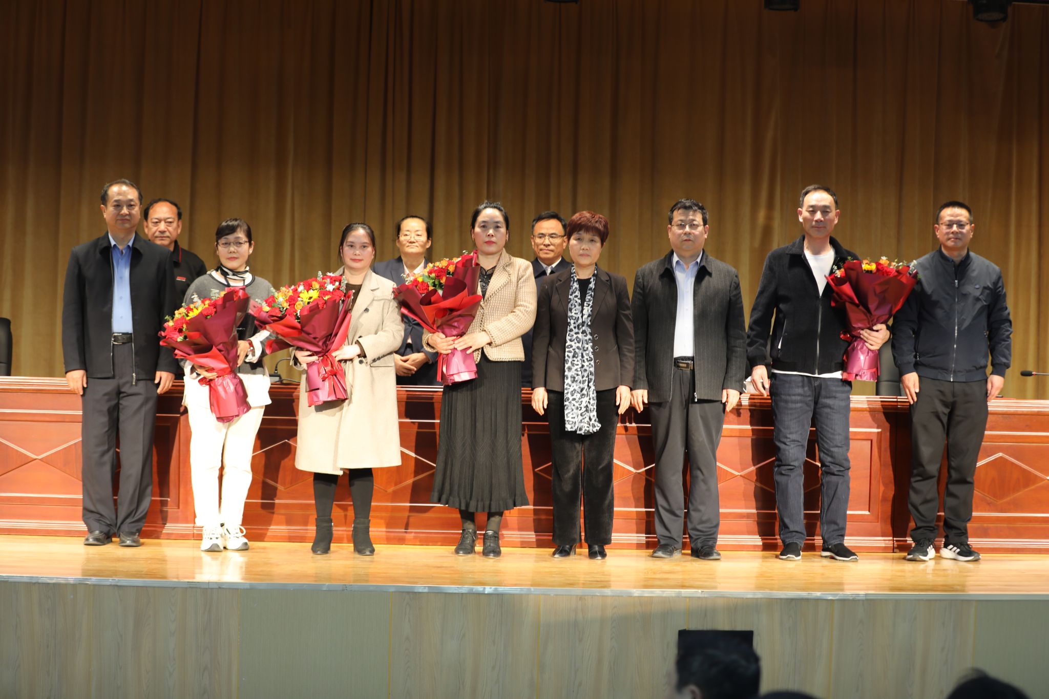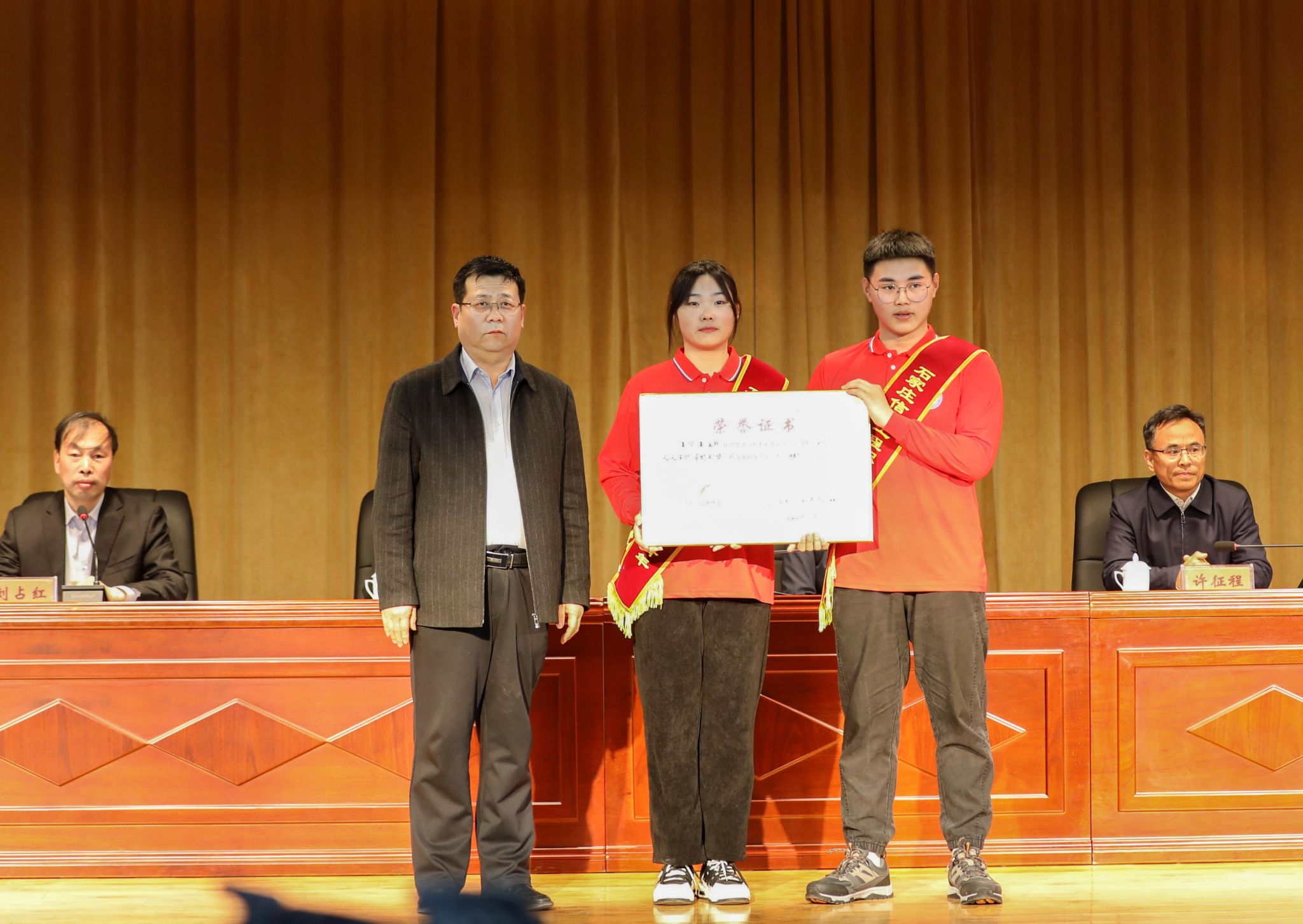 院长许征程,石家庄市教育局二级调研员、石家庄市立德教育发展基金会理事马力,副院长赵伟分别为“信工好青年”“育人楷模”颁发荣誉证书、奖金和奖品。领导班子成员为王浩然、王宁两名同学的家长赠送鲜花,感谢家长的辛勤栽培和默默付出。