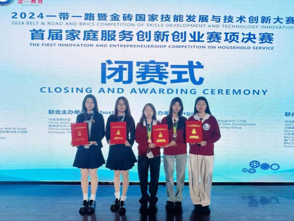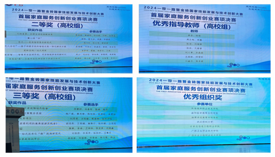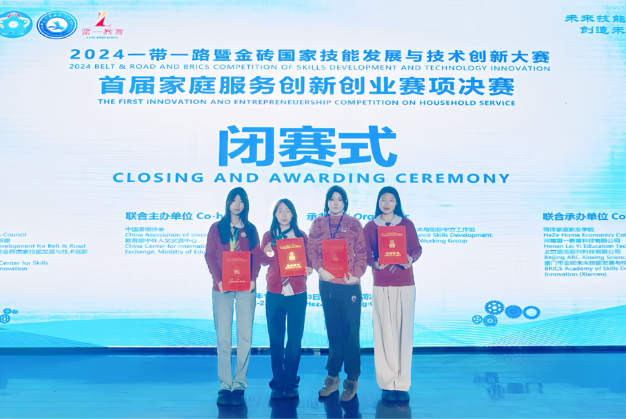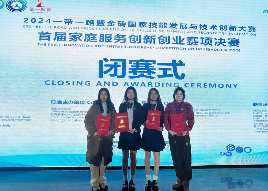 2024年12月23日,2024一带一路暨金砖国家技能发展与技术创新大赛首届家庭服务创新创业赛项决赛在山东菏泽家政技术学院落幕。在全国高校组决赛中,beat365官网生物医药技术系婴幼儿托育服务与管理专业的2个参赛项目从70多个决赛项目中脱颖而出,分别荣获二等奖、三等奖。其中,姜梦琦、王淼、杨若冰、霍鑫团队的“爱特宝妈一站式托育到家”项目荣获二等奖(指导教师史晶晶刘义青),史晶晶、刘义青获“优秀指导教师奖”,学院荣获优秀组织奖;刘思雨、方雨璇、靳紫萌、赵辛子钰团队的“爱惠托职工爱心托育”项目(指导教师白静、史晶晶)荣获三等奖。