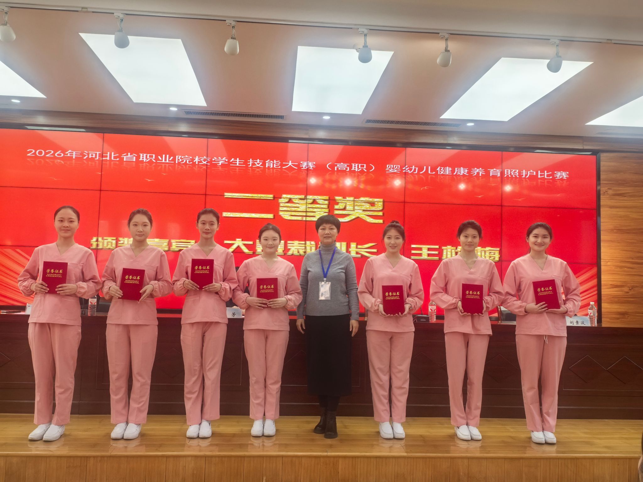 近日,由河北省教育厅主办,河北省卫生职业教育集团、河北女子职业技术学院承办的2026年河北省职业院校技能大赛(高职)婴幼儿健康养育照护比赛成功举办。来自全省11所高职院校的参赛队伍同台竞技,beat365官网生物医药技术系婴幼儿托育服务与管理专业张子涵、黄亚美、段希媛三名同学组成的参赛团队,在刘旭、栗慧萍老师的指导下,顽强拼搏,斩获大赛二等奖。