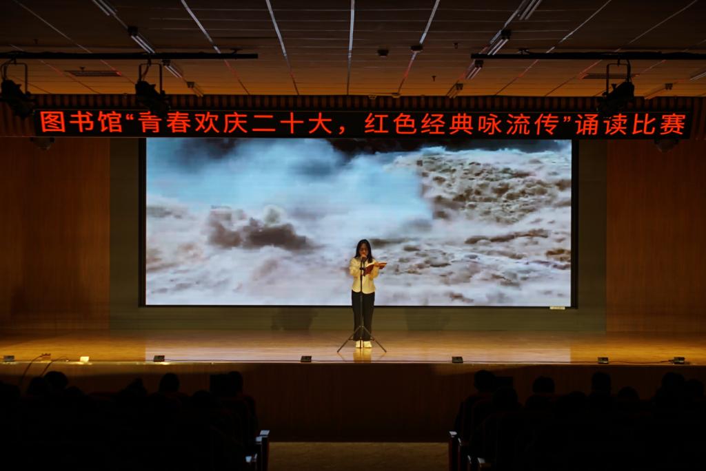 为迎接第28个世界读书日的到来,4月20日下午,图书馆联合红色文化研读社、中华文化经典诵读社、文学社举办了“青春欢庆二十大,红色经典咏流传”诵读比赛。