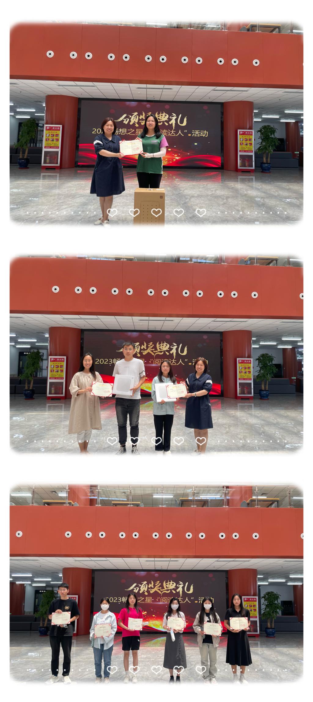 2023年6月14日中午,图书馆在二楼大厅举办了“畅想之星”好书共读活动颁奖仪式。近400名学院师生参加了此次图书馆读书月“畅想畅读·阅见美好”主题线上好书共读活动,9名师生脱颖而出,分别荣获“阅读达人”一、二、三等奖。
