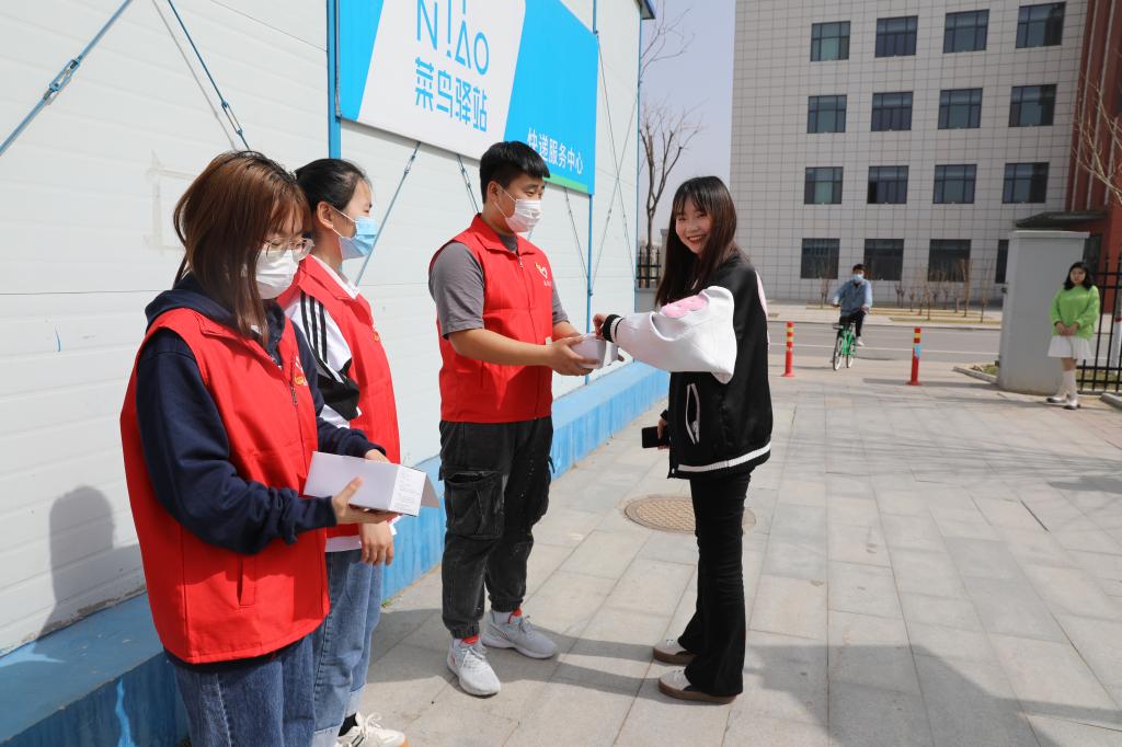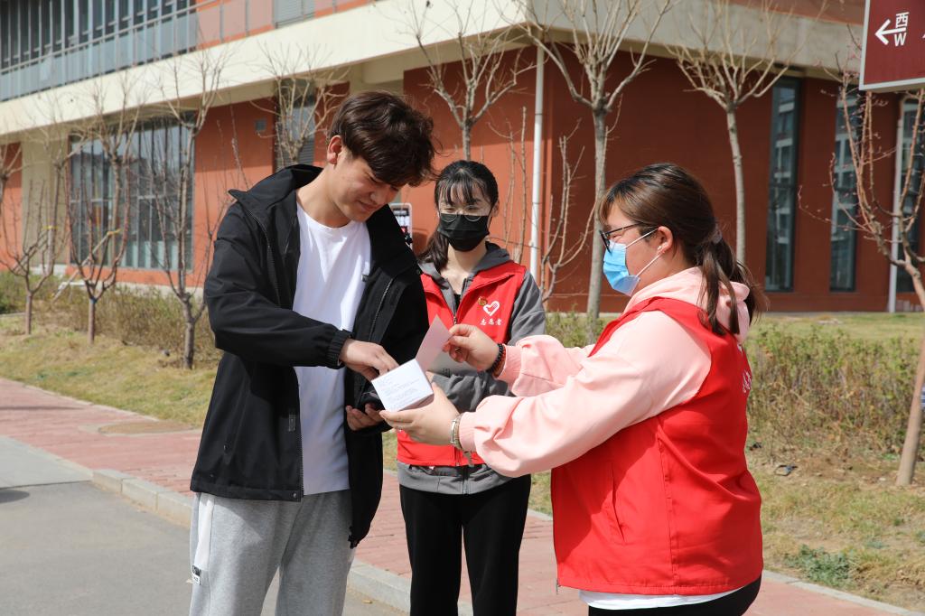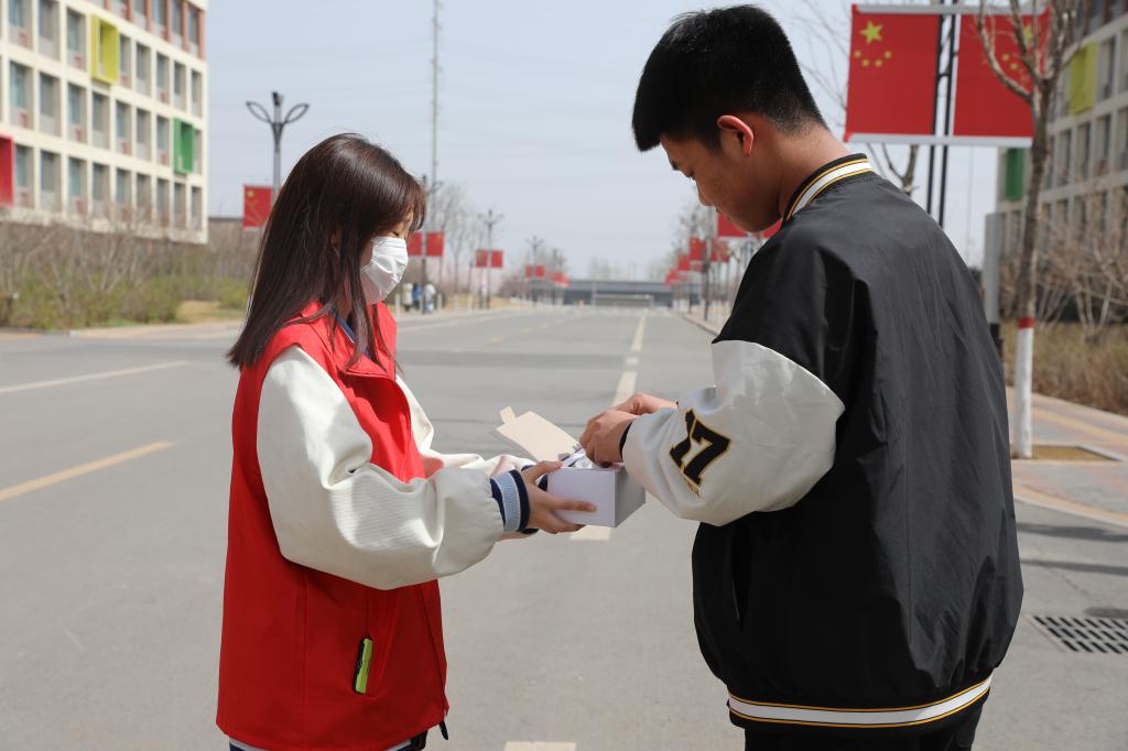 学生志愿者对在校的学生免费发放口罩并提醒疫情防控的重要性,务必公共场所佩戴口罩。